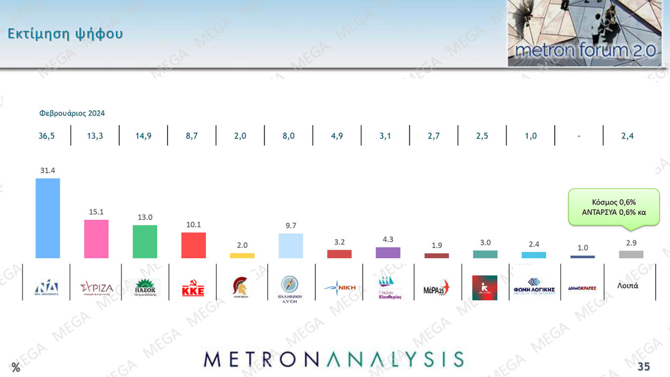 H N.Δ διατηρεί σταθερά μεγάλο προβάδισμα με διαφορά 21% στην εκτίμηση ψήφου έναντι του ΣΥΡΙΖΑ που περνάει ξανά δεύτερος. Έχει επίδοση 34.3% έναντι 13.4% του ΣΥΡΙΖΑ και ακολουθούν ΠΑΣΟΚ με 12.5%, η ΕΛΛΗΝΙΚΗ ΛΥΣΗ με 10.1%, το Κ.Κ.Ε με 9.4% , η ΝΙΚΗ με 4.3%, η ΠΛΕΥΣΗ ΕΛΕΥΘΕΡΙΑΣ και οι Δημοκράτες – Α. Λοβέρδος με 2.9% η ΝΕΑ ΑΡΙΣΤΕΡΑ με 2.8%, οι ΣΠΑΡΤΙΑΤΕΣ με 2.5%, η ΜΕΡΑ 25 με 1.9% και το ΑΛΛΟ ΚΟΜΜΑ με 2.8%. Σημειώνεται ότι το ΠΑΣΟΚ εμφανίζει την μεγαλύτερη πτώση με 1.1% σε σχέση με την έρευνα στις 19/2 ένα μήνα πριν και 3.5% σε σχέση με την έρευνα τέλη Νοεμβρίου οπότε και περνούσε στην δεύτερη θέση. Αντίστοιχα για τον ΣΥΡΙΖΑ είναι η πρώτη μετεκλογική έρευνα που δεν δείχνει νέα πτώση και αυξάνει στο ίδιο χρονικό διάστημα τις δυνάμεις του κατά 0.9% , περνώντας έτσι στην 2η θέση.