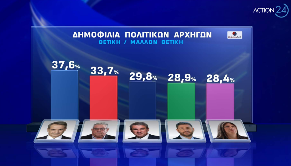Ο Κ. Μητσοτάκης υπερέχει τόσο στην δημοφιλία, όσο περισσότερο και στην καταλληλότητα για Πρωθυπουργός . Οι δημοφιλίες των Πολιτικών Αρχηγών είναι: Κ. Μητσοτάκης 37.6%, Δ.Κουτσούμπας 33.7%, Α. Λοβέρδος 29.8%, Ν. Ανδρουλάκης 28.9%, Ζωή Κωνσταντοπούλου 28.4%, Κ. Βελόπουλος 27.6% , Σ. Κασσελάκης 23.2%, Α. Χαρίτσης 18.8%, Δ. Νατσιός 13.8% , Β. Στίγκας 7.5%.