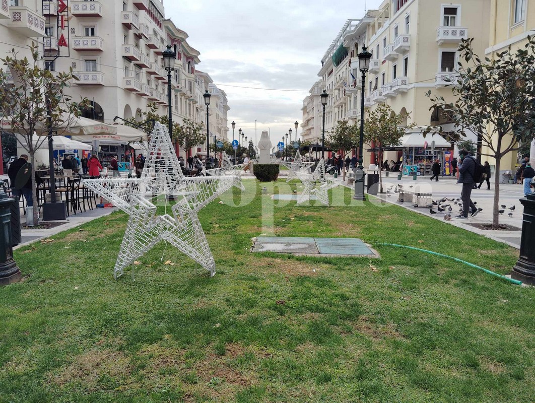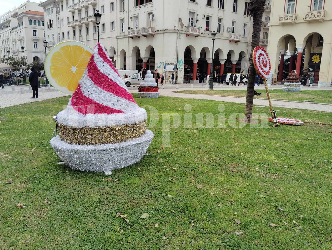 Οι τελευταίες πινελιές μπαίνουν σήμερα, με τα τεράστια στολίδια να «παίρνουν» τη θέση τους και ήδη να «ποζάρουν» σε φωτογραφίες περαστικών. Αστέρια, αρκουδάκια, γλειφιτζούρια και κέικ, είναι μερικά από αυτά που θα δείτε αύριο να φωτίζουν την πόλη.