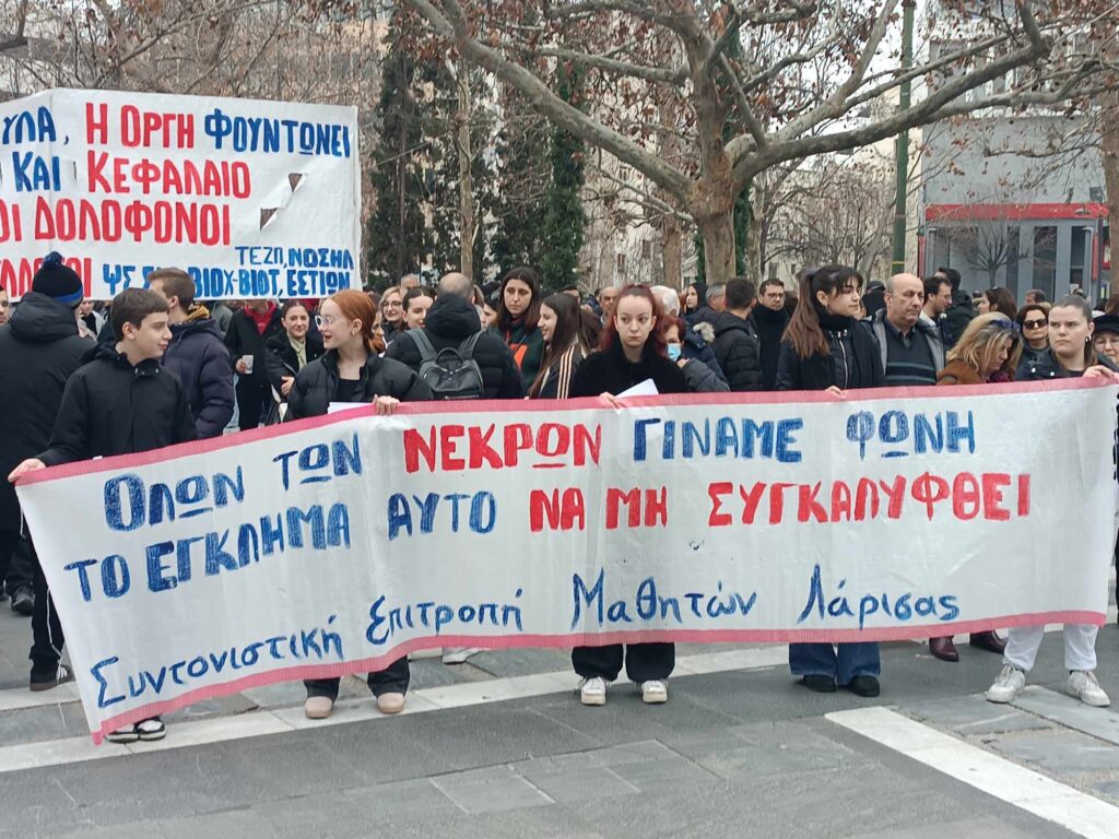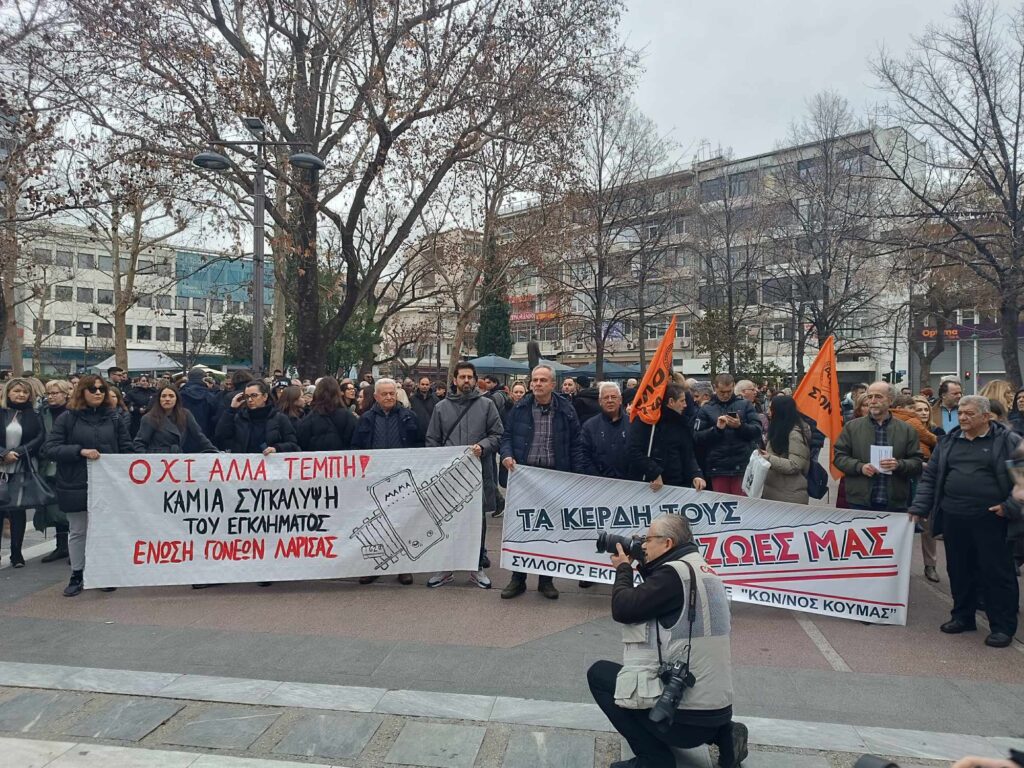 Στην Κεντρική Πλατεία της Λάρισας έχουν συγκεντρωθεί εκατοντάδες πολίτες για το έγκλημα των Τεμπών.