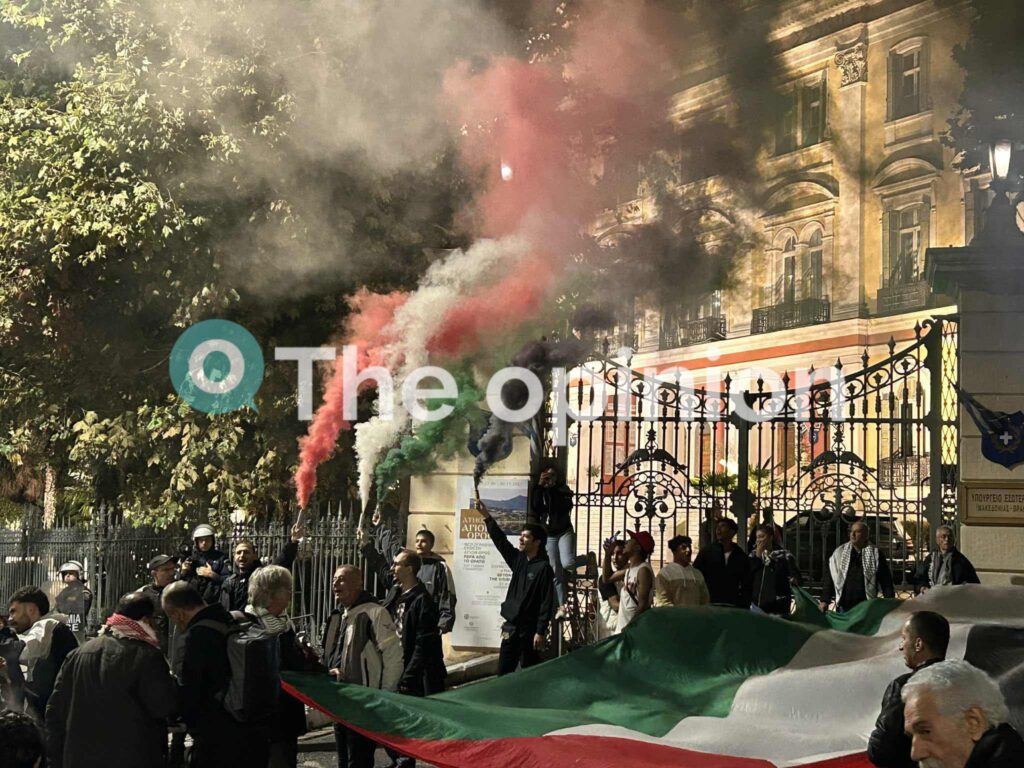 Στη διαμαρτυρία συμμετέχουν εκατοντάδες άτομα που δηλώνουν τη στήριξή τους στην αποστολή ανθρωπιστικής βοήθειας και την αντίθεσή τους στον αποκλεισμό της Γάζας.