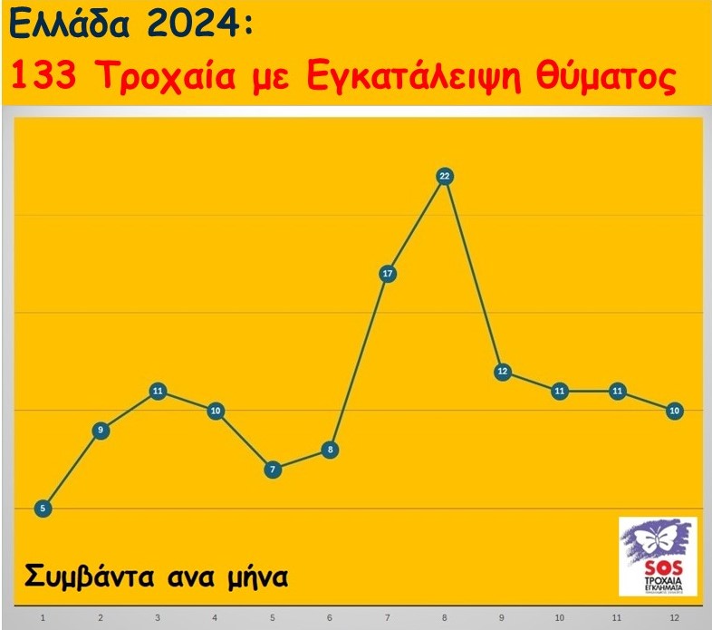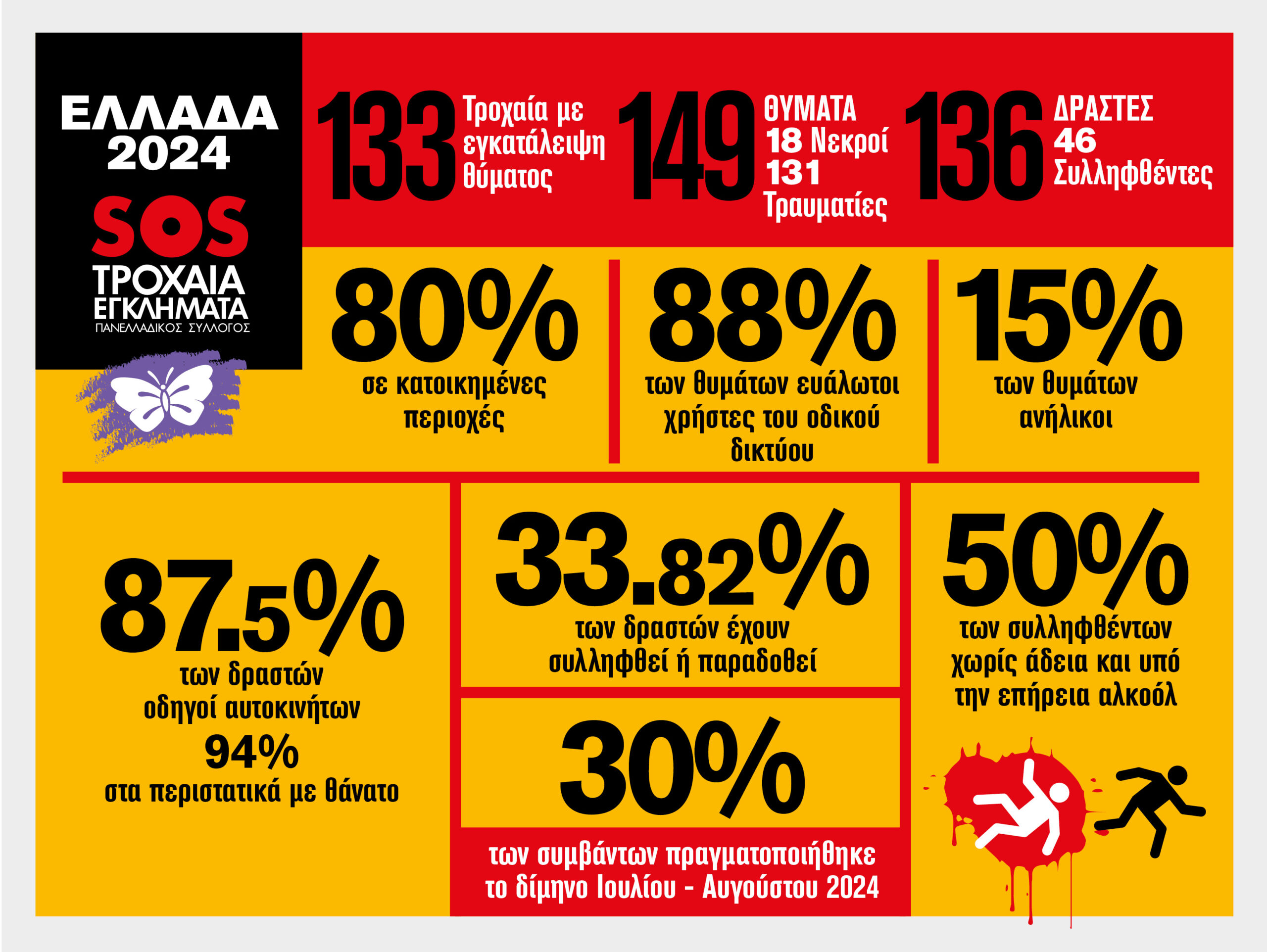 Σύμφωνα με τον οργανισμό SOS Τροχαία Εγκλήματα, 133 τροχαία ατυχήματα με εγκατάλειψη σημειώθηκαν στη χώρα το 2024 με 149 θύματα, εκ των οποίων οι 18 κατέληξαν νεκροί και οι υπόλοιποι τραυματίστηκαν – αρκετοί εξ αυτών σοβαρά.