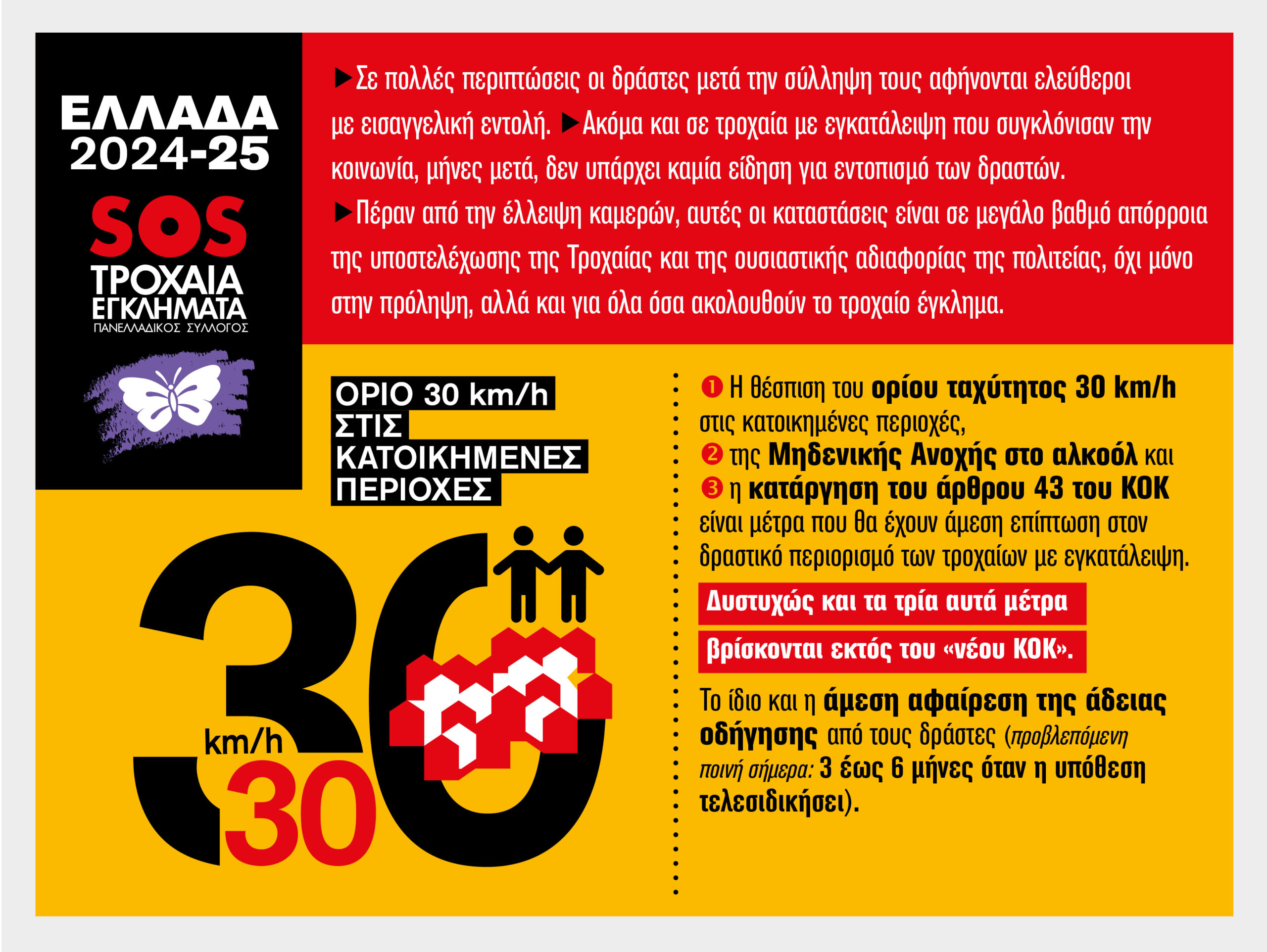 Παράλληλα, ο Πανελλήνιος Σύλλογος, SOS Τροχαία Εγκλήματα ζητά την Η θέσπιση του ορίου ταχύτητας στα 30 χλμ/ώρα στις κατοικημένες περιοχές, η μηδενική ανοχή στο αλκοόλ, καθώς και η κατάργηση του άρθρου 43 του ΚΟΚ –που προσφέρει προστασία στους δράστες– αποτελούν κρίσιμα μέτρα που πρέπει να εφαρμοστούν άμεσα. Η κοινωνία δεν μπορεί να παραμένει παρατηρητής σε μια πραγματικότητα που κοστίζει ζωές.