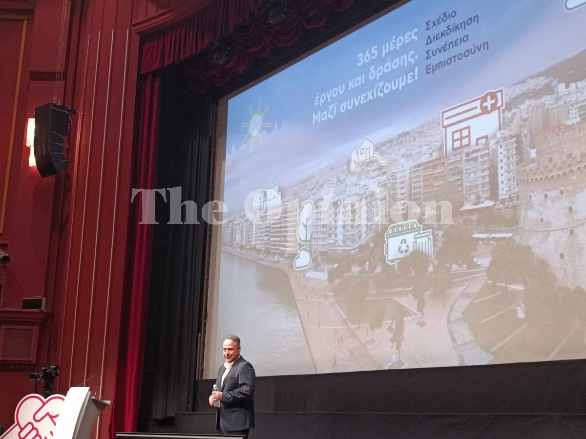“Δώσαμε μια κοινή υπόσχεση: να αλλάξουμε τη Θεσσαλονίκη” ανέφερε στην αρχή της ομιλίας του βάζοντας το σημείο έναρξης δύο χρόνια πριν όταν ξεκινούσε την προσπάθεια για το Δήμο Θεσσαλονίκης από τον ίδιο χώρο όπου έκανε την πρώτη του δημόσια ομιλία.