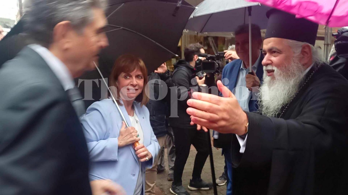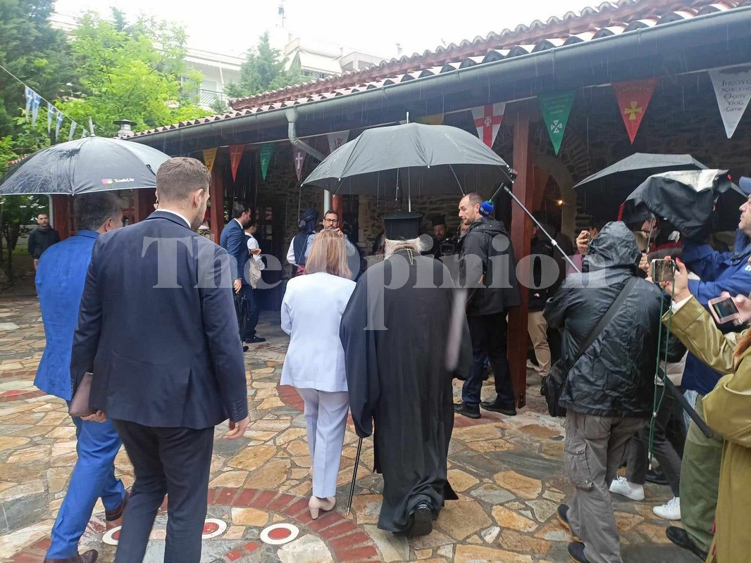 Λίγο μετά τις 11 το πρωί και υπό βροχή, υποδέχθηκαν την Κατερίνα Σακελλαροπούλου, ο Μητροπολίτης Νεαπόλεως και Σταυρουπόλεως Βαρνάβας και ο δήμαρχος Κορδελιού – Ευόσμου, Ελευθέριος Αλεξανδρίδης, με την ΠτΔ να αστειεύεται σχετικά με τον άστατο καιρό της πόλης.