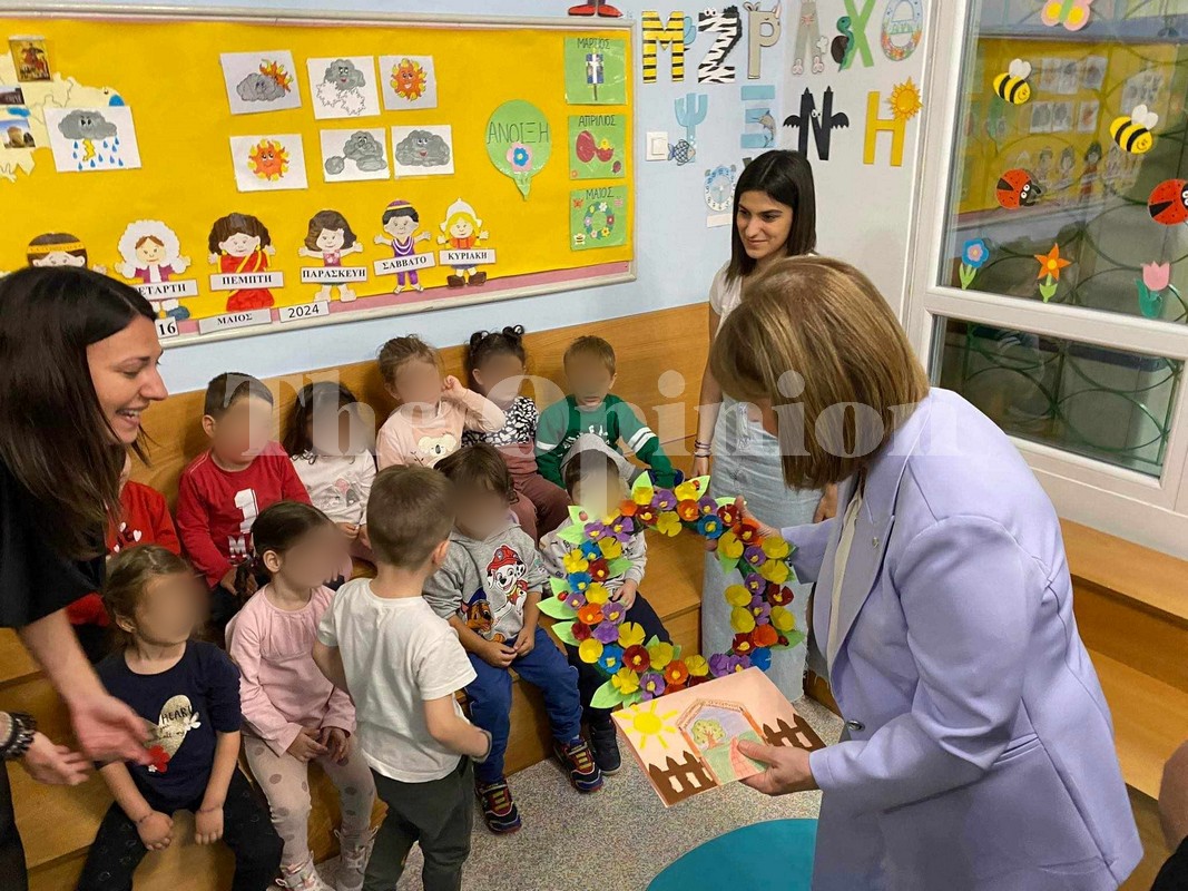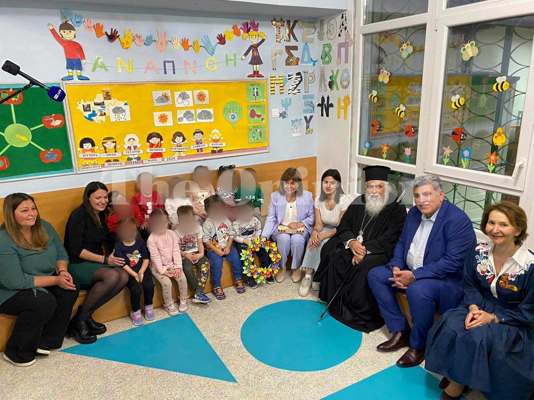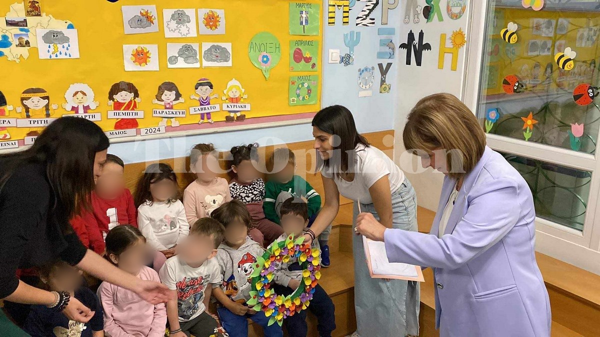 Με τραγούδια και λουλούδια υποδέχθηκαν την Κατερίνα Σακελλαροπούλου οι μικροί μαθητές του παιδικού σταθμού που λειτουργεί υπό την αιγίδα της Μητρόπολης.