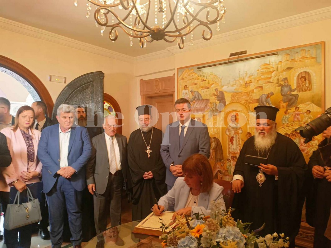 Η ΠτΔ, αφού έγραψε στο βιβλίο επισκεπτών της Επισκοπής, έλαβε μια πένα ως δώρο από τον Μητροπολίτη Νεαπόλεως Σταυρουπόλεως, Βαρνάβα.