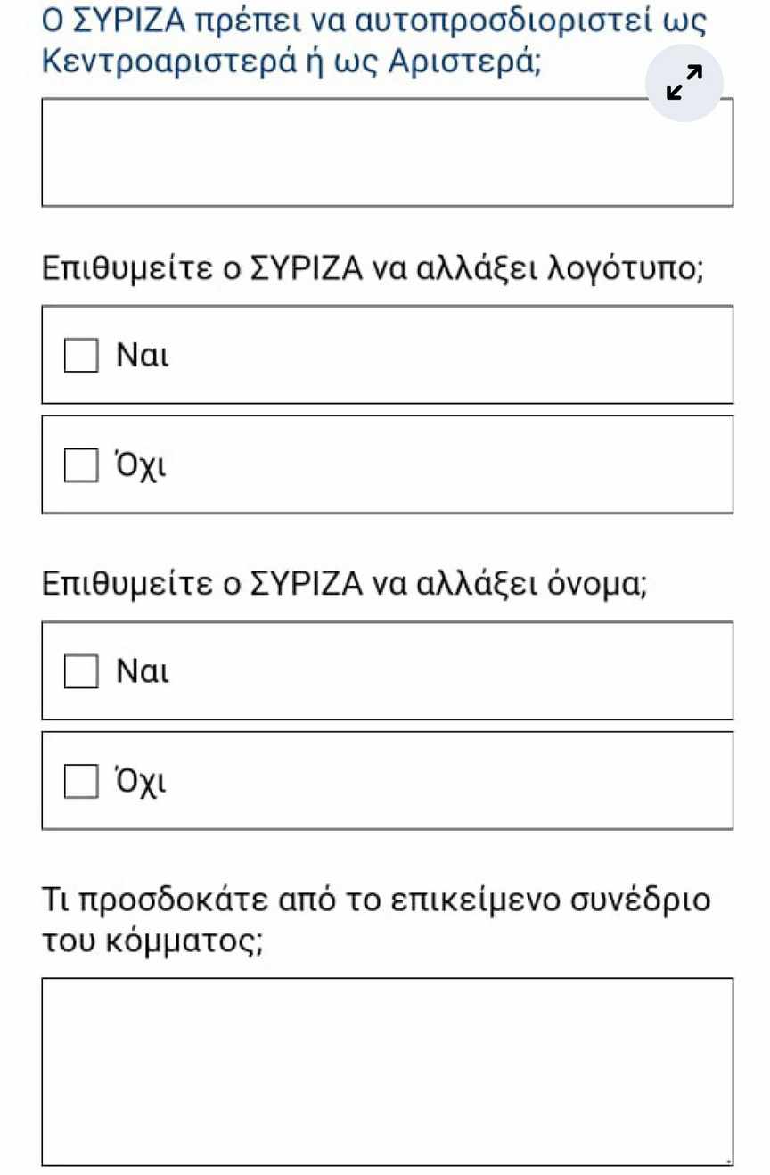 Το ερωτηματολόγιο που βρίσκεται στον isyriza.gr μετά από απόφαση του ίδιου του προέδρου του ΣΥΡΙΖΑ ανοίγει την συζήτηση για αλλαγή του ονόματος, του σήματος ακόμα και της πολιτικής ιδεολογίας του ΣΥΡΙΖΑ. Μάλιστα οι ερωτήσεις για την δομή και τα όργανα του ΣΥΡΙΖΑ δείχνουν την διάθεση του Στέφανου Κασσελάκη.