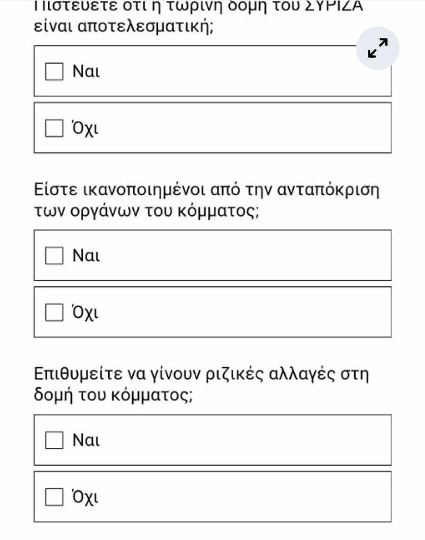 Το ερωτηματολόγιο ξεκινάει με τις ερωτήσεις “Πιστεύετε ότι η τωρινή δομή του ΣΥΡΙΖΑ είναι αποτελεσματική;” , “Είστε ικανοποιημένοι από την ανταπόκριση των οργάνων του κόμματος;”, “επιθυμείτε να γίνουν ριζικές αλλαγές στην δομή του κόμματος;”.