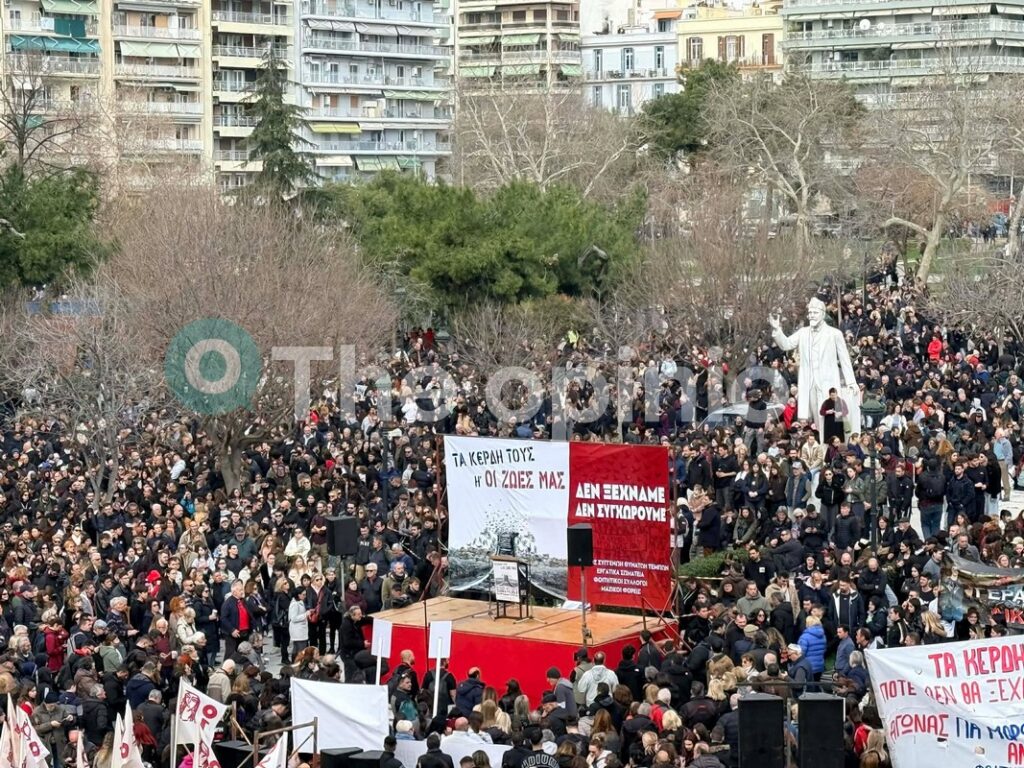 Από την Καμάρα έως την Αντιγονιδών, κατά μήκος της Εγνατίας οδού, άνθρωποι κάθε ηλικίας συγκεντρώθηκαν στην πλατεία Αρχαίας Αγοράς, γύρω από το άγαλμα του Βενιζέλου, για να ξεκινήσουν στη συνέχεια πορεία με κατεύθυνση τον Σιδηροδρομικό Σταθμό.