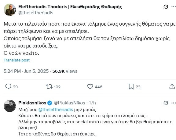 Εκεί, όπου ο Θοδωρής Ελευθεριάδης, γιος της αδικοχαμένης Μαρίας Εγούτ, έκανε λόγο για τηλεφωνικές απειλές που δέχθηκε από συγγενή θύματος, ύστερα από ανάρτησή του, σχετικά με ενδεχόμενη κατάργηση του άρθρου 86.