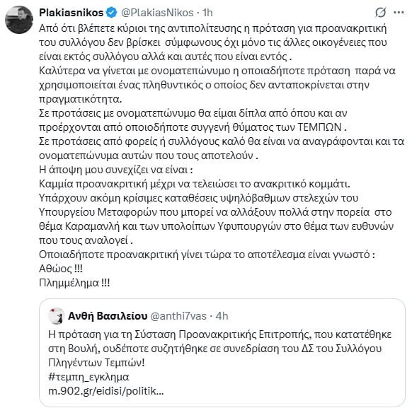 Η πρόταση αυτή για Προανακριτική μπορεί να κατατέθηκε στη Βουλή από τον “Σύλλογο Ατόμων Πληγέντων Δυστυχήματος Τεμπών 28 Φεβρουαρίου 2023” και από τη Μαρία Καρυστιανού. Ωστόσο, αίσθηση προκαλεί πως δύο μέλη του Διοικητικού Συμβουλίου του Συλλόγου, η γραμματέας, Ελένη Βασάρα και το μέλος, Βασίλης Παυλίδης, δηλώνουν άγνοια τόσο για το περιεχόμενό της πρότασης, όσο και για την ίδια την κίνηση, για την οποία, όπως λένε, έμαθαν από τα μέσα ενημέρωσης και τα κοινωνικά δίκτυα, καθώς δεν συζητήθηκε στο Διοικητικό Συμβούλιο.