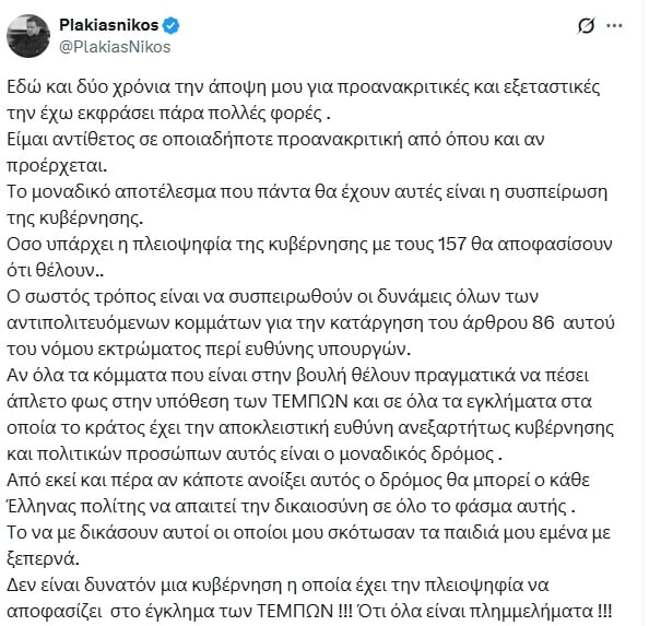 Την ίδια ώρα, άλλοι συγγενείς θυμάτων, όπως για παράδειγμα ο Νίκος Πλακιάς, πατέρας της Χρυσής και της Θώμης και θείος της Αναστασίας, δηλώνουν εντελώς αντίθετοι με κάθε ανάλογη κίνηση. “Είμαι αντίθετος σε οποιαδήποτε προανακριτική από όπου και αν προέρχεται. Το μοναδικό αποτέλεσμα που πάντα θα έχουν αυτές είναι η συσπείρωση της κυβέρνησης. Οσο υπάρχει η πλειοψηφία της κυβέρνησης με τους 157 θα αποφασίσουν ό,τι θέλουν… Ο σωστός τρόπος είναι να συσπειρωθούν οι δυνάμεις όλων των αντιπολιτευόμενων κομμάτων για την κατάργηση του άρθρου 86, αυτού του νόμου εκτρώματος περί ευθύνης υπουργών” έγραψε με ανάρτησή του στα μέσα κοινωνικής δικτύωσης.