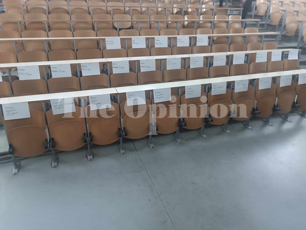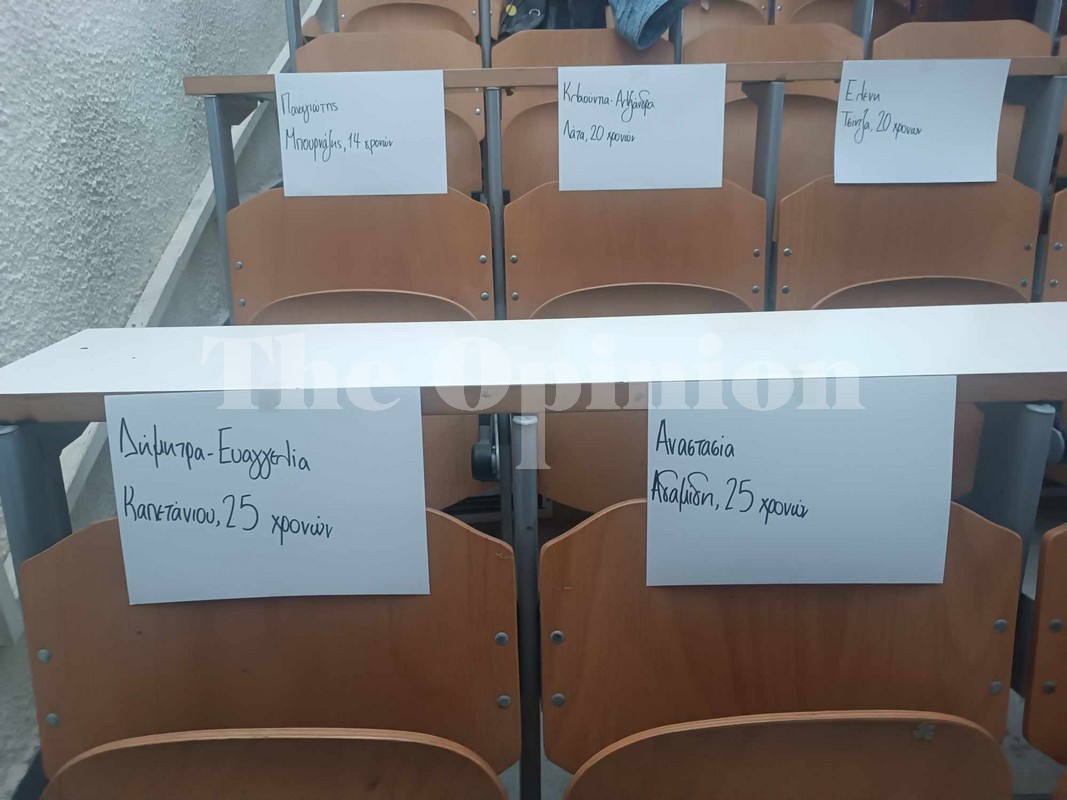 Οι παρευρισκόμενοι στο Μικρό Αμφιθέατρο Α της Σχολής Νομικών, Οικονομικών και Πολιτικών Επιστημών του ΑΠΘ, άφησαν 57 κενές θέσεις, μία για κάθε θύμα. Στα καθίσματα αναγράφονται τα ονόματα και η ηλικία όλων όσων έχασαν τη ζωή τους το μοιραίο βράδυ της 28ης Φεβρουαρίου του 2023.