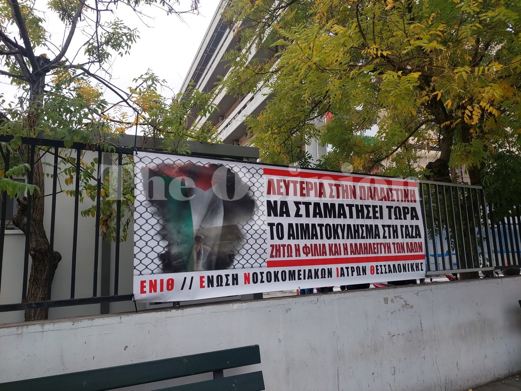 Ένα γιγάντιο πανό κρεμάστηκε στην κεντρική πρόσοψη του Νοσοκομείου «Ιπποκράτειο» από μέλη της Ένωσης Νοσοκομειακών Γιατρών Θεσσαλονίκης, ως ένδειξη συμπαράστασης στον λαό της Παλαιστίνης και τους γιατρούς που καθημερινά δίνουν μάχη για να βοηθήσουν τους χιλιάδες τραυματίες του πολέμου.