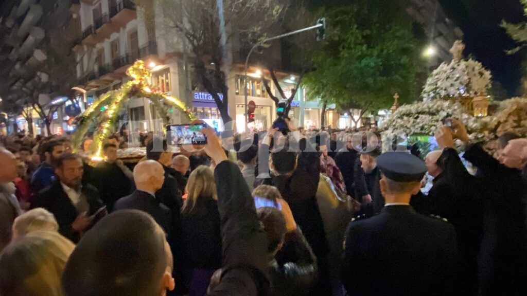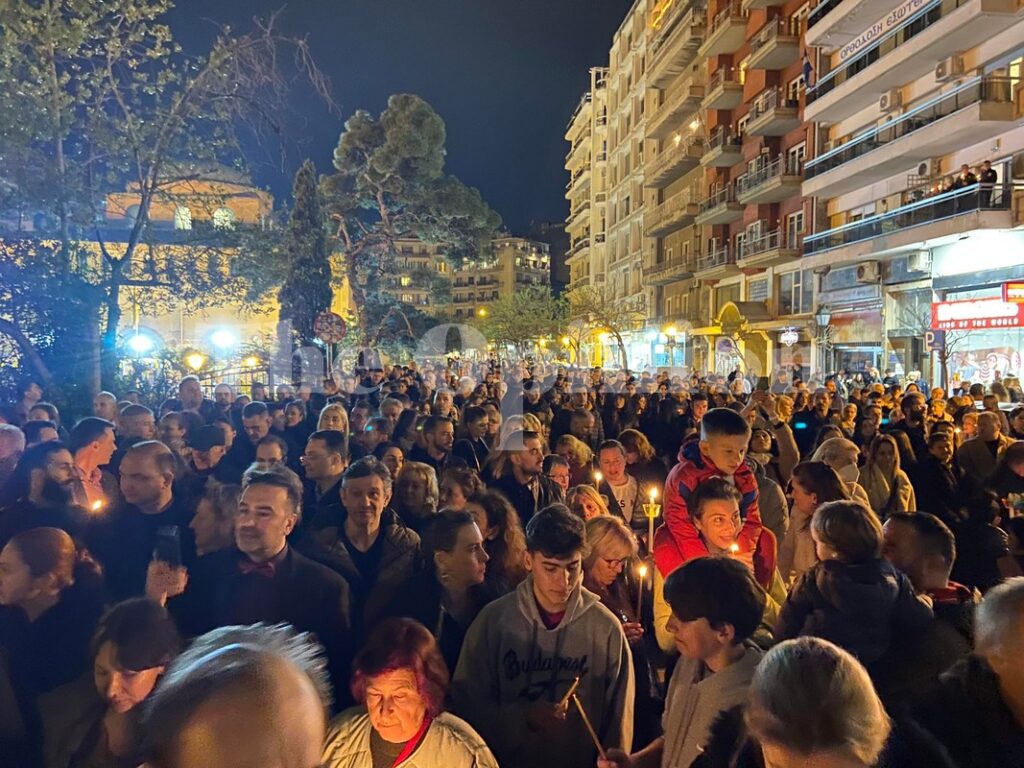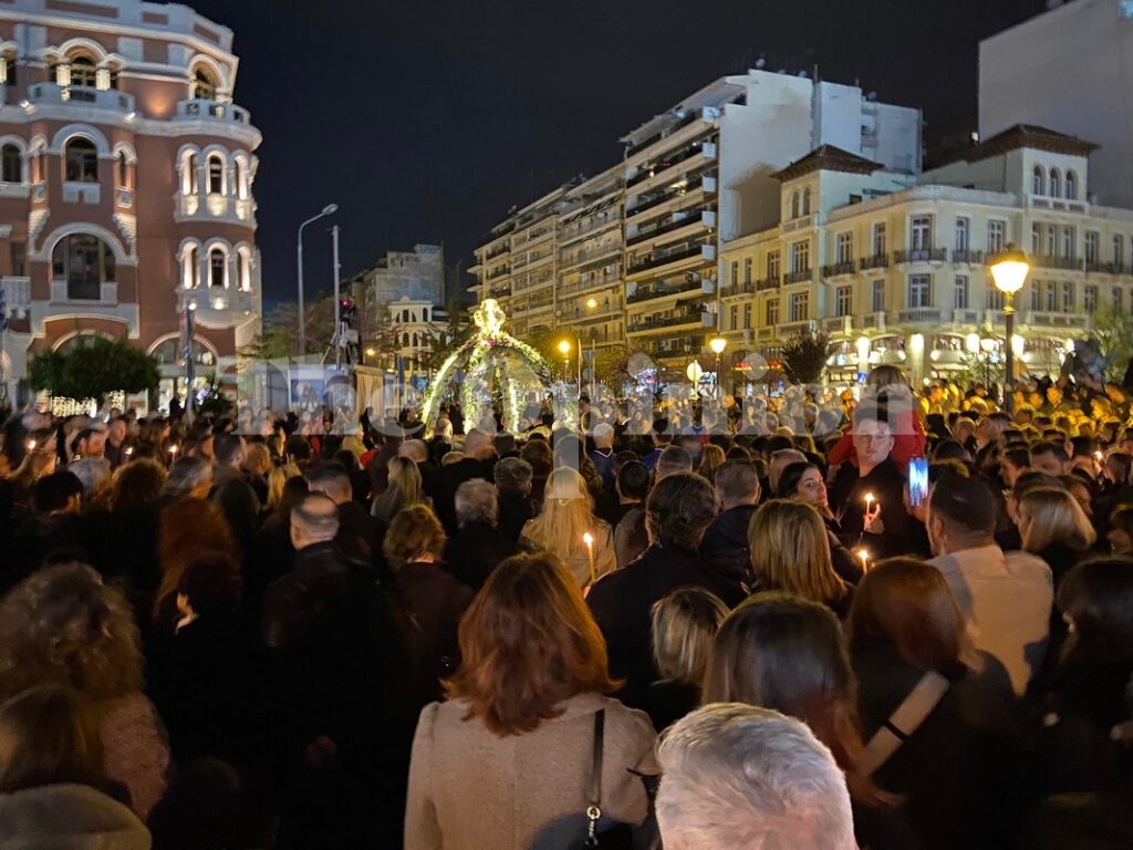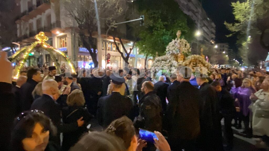 Κορυφαία στιγμή η συνάντηση του Επιταφίου της Αγίας Σοφίας με τον Επιτάφιο της Ιεράς Μητρόπολης. Πιστοί ψέλνουν όλοι μαζί δημιουργώντας μια μοναδική εμπειρία για όσες και όσους συμμετέχουν στην ιεροτελεστία.