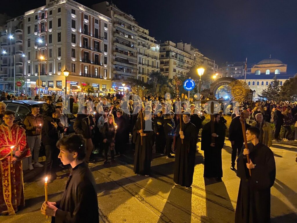Με θρησκευτική ευλάβεια και υπό τον ήχο πένθιμων εμβατηρίων βρίσκεται σε εξέλιξη αυτή την στη Θεσσαλονίκη η περιφορά του Επιταφίου της Αγίας Σοφίας.