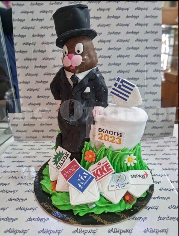 Ο φετινός σοκολατένιος λαγός είναι εμπνευσμένος από την ελληνική βουλή και τις επικείμενες εκλογικές αναμετρήσεις.