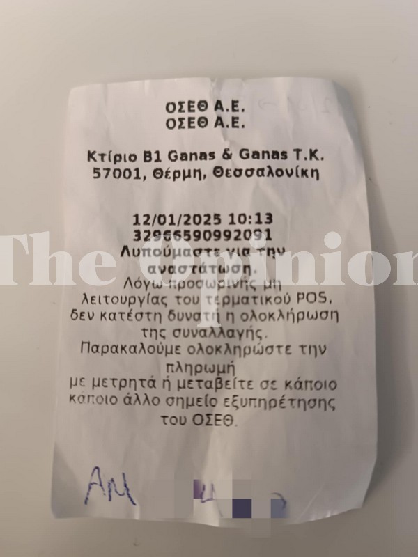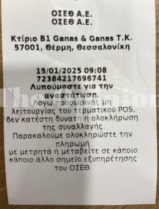 «Λυπούμαστε για την αναστάτωση. Λόγω προσωρινής μη λειτουργίας του τερματικού POS, δεν κατέστη δυνατή η ολοκλήρωση της συναλλαγής. Παρακαλούμε ολοκληρώστε την πληρωμή με μετρητά ή μεταβείτε σε κάποιο άλλο σημείο εξυπηρέτησης του ΟΣΕΘ».