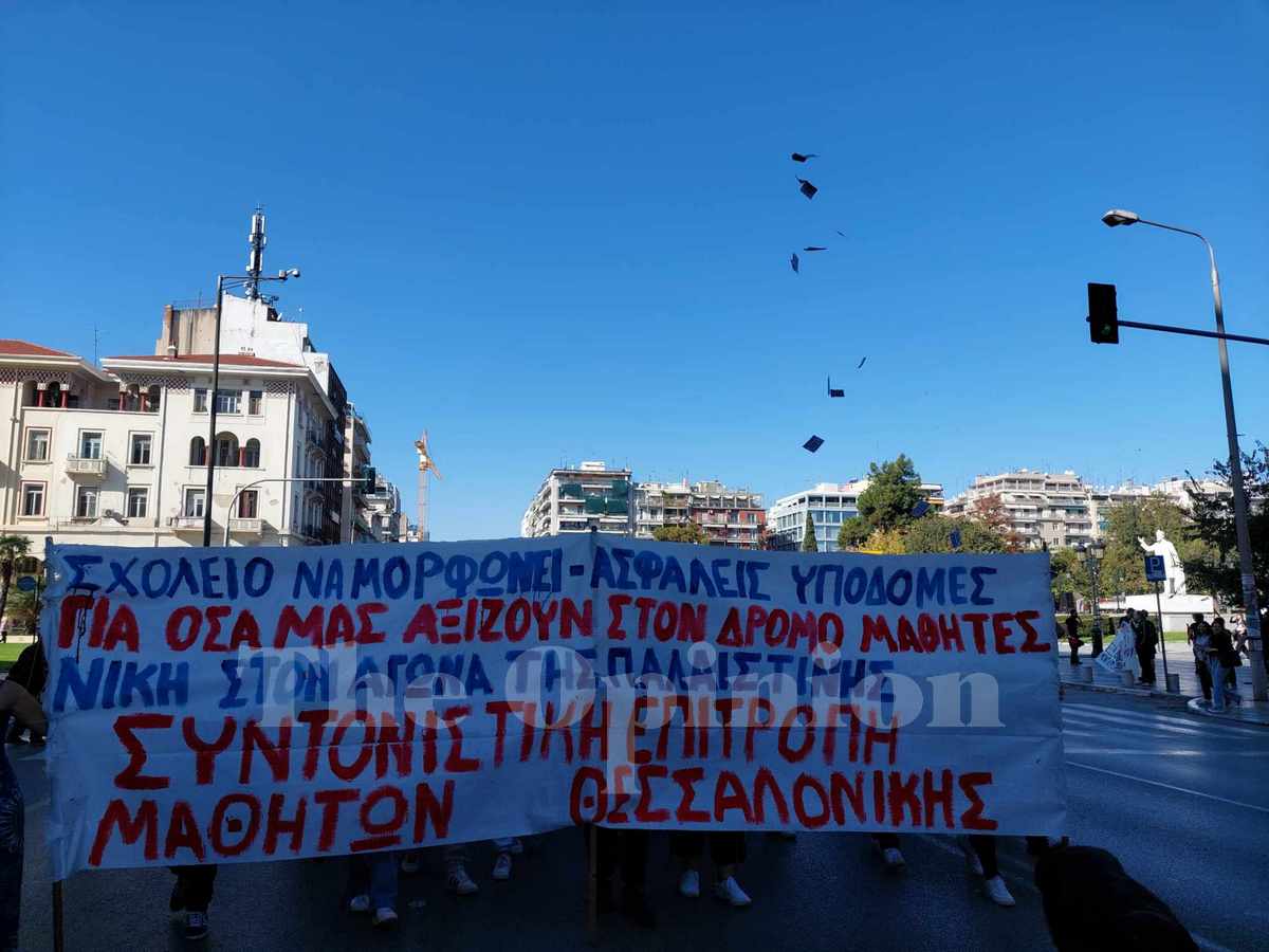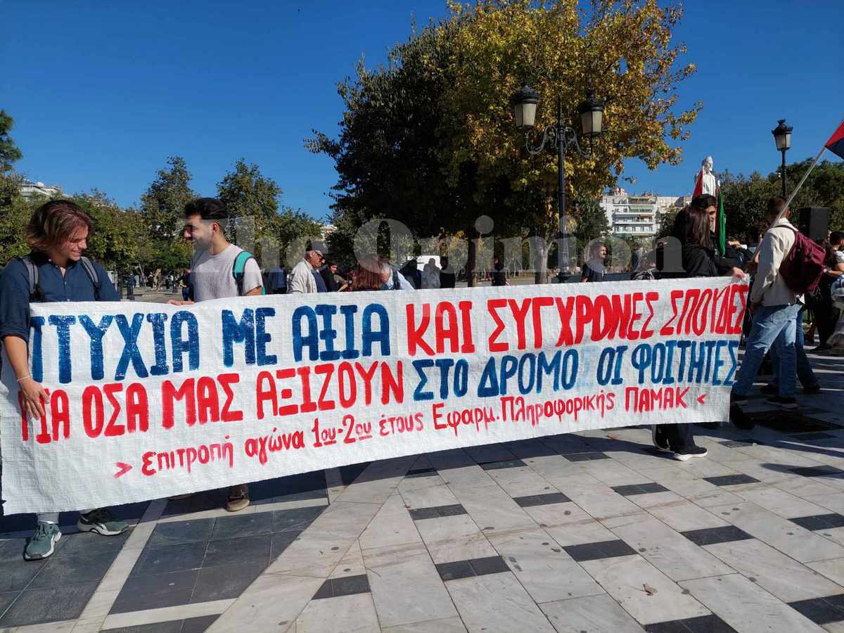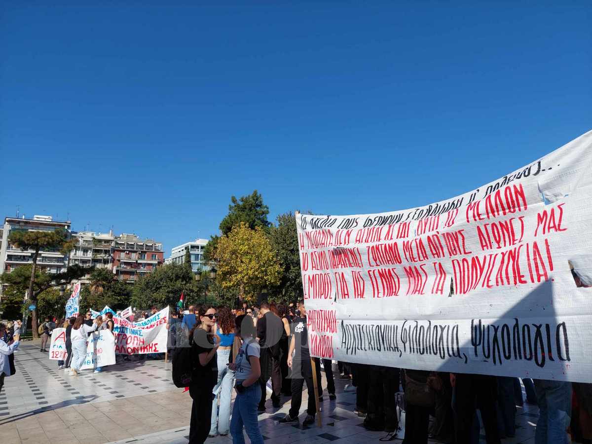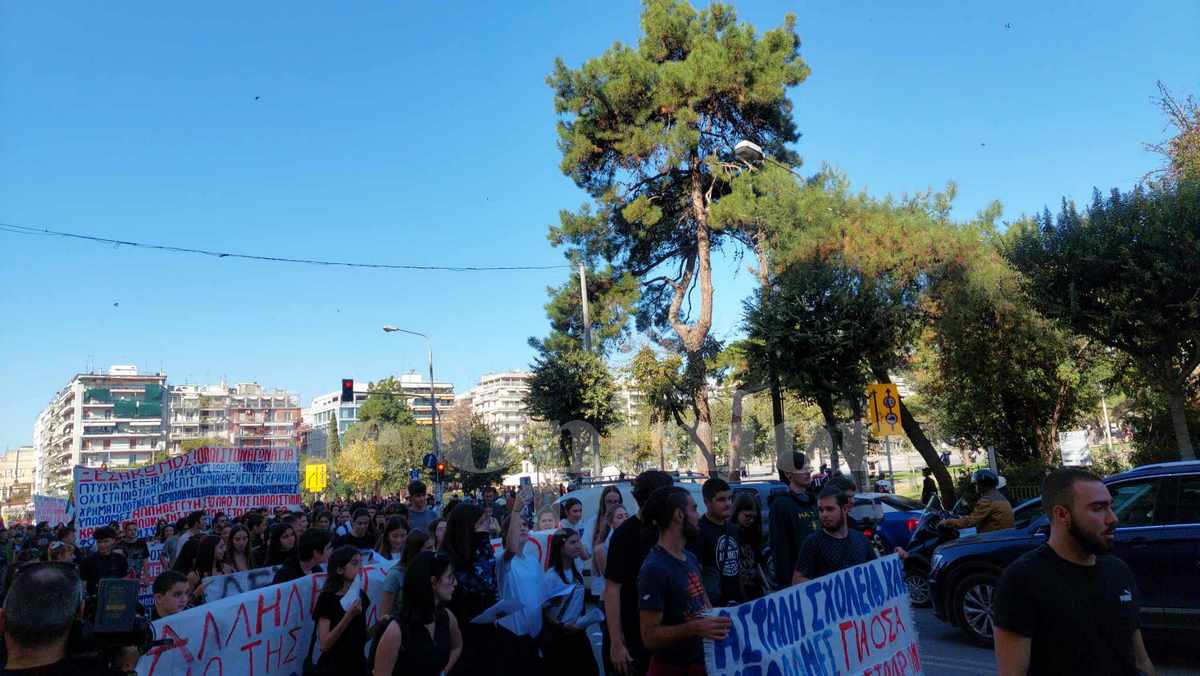 Από πλευράς της, η πρόεδρος του συλλόγου φοιτητών Χημικού του ΑΠΘ, Χριστίνα Σταμούλη, είπε πως σήμερα μαθητές, φοιτητές και εκπαιδευτικοί βγαίνουν στους δρόμους, φωνάζουν και διεκδικούν. «Θέλουμε εδώ και τώρα πτυχία με αξία και δωρεάν σπουδές. Το τελευταίο διάστημα παρακολουθούμε το έγκλημα που συμβαίνει στην Παλαιστίνη. Καταδικάζουμε την εμπλοκή της χώρας μας στη σφαγή του παλαιστινιακού λαού και διεκδικούμε να σταματήσει κάθε οικονομική, πολιτική στρατηγική και στρατιωτική συνεργασία της χώρας μας με το κράτος δολοφόνο του Ισραήλ”, σχολίασε. “Ολα αυτά τα λέμε σήμερα γιατί την ίδια ώρα που μας λένε ότι δεν έχουμε λεφτά για τις σπουδές μας δίνουν δισεκατομμύρια ευρώ στο ΝΑΤΟ», είπε.