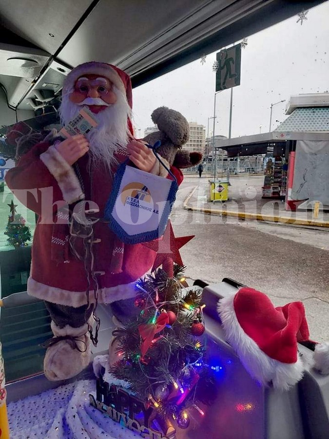 Πρόκειται για λεωφορείο του ΚΤΕΛ Θεσσαλονίκης που εκτελεί τη διαδρομή Ν.Σ Σταθμός-Ωραιόκαστρο κι εδώ και λίγες ημέρες έχει ξεχωρίσει λόγω του στολισμού του.