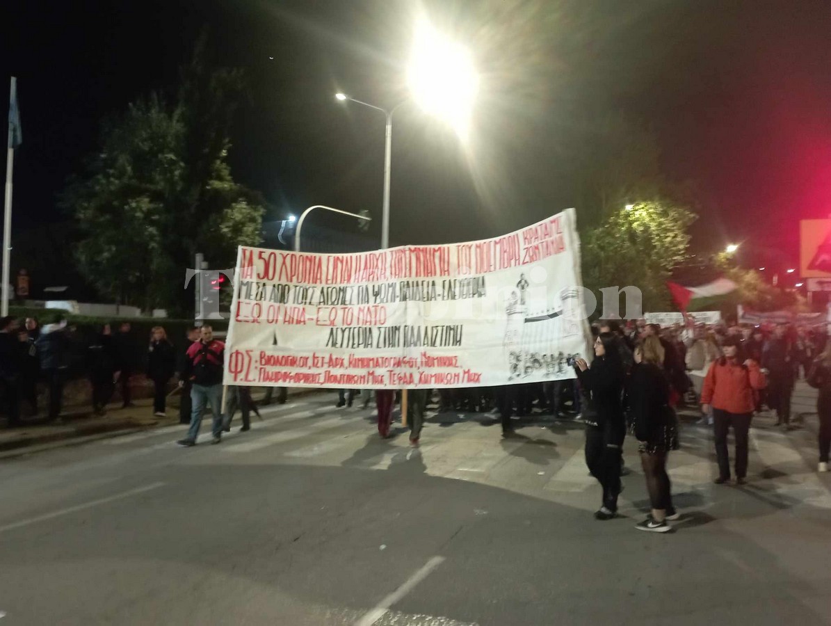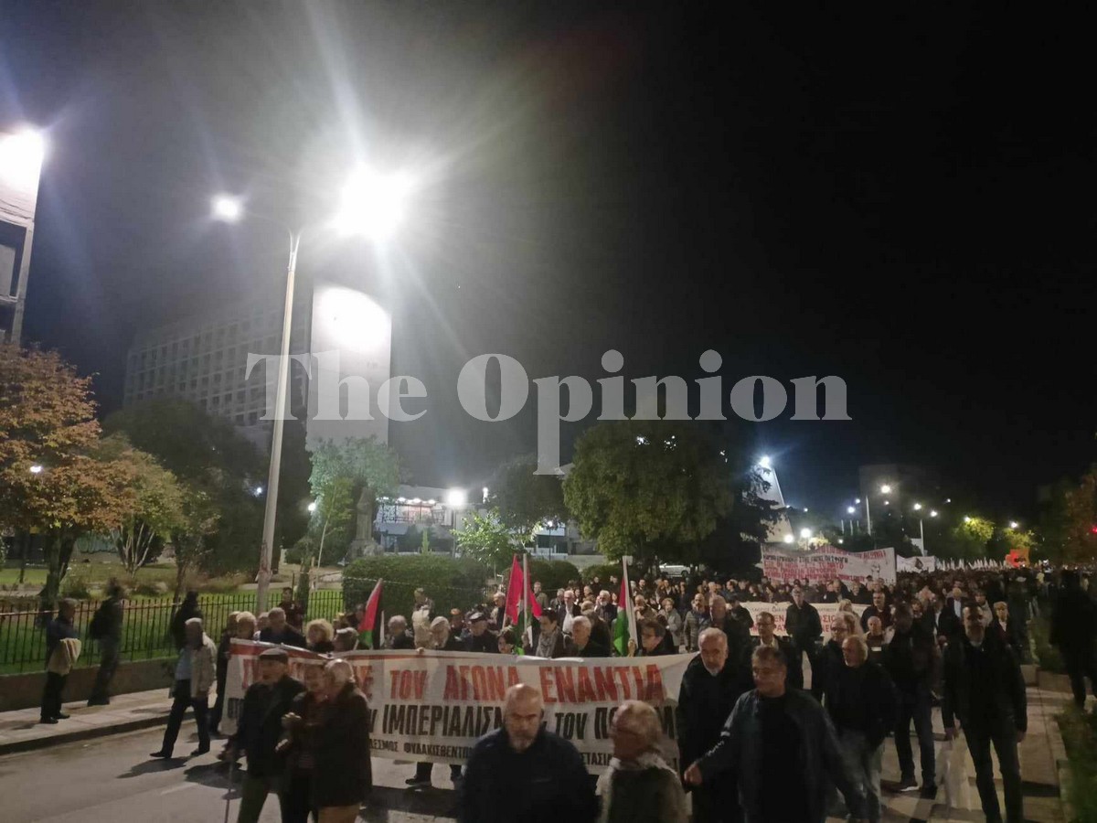 Φωνάζοντας δυνατά συνθήματα τόσο στη μνήμη της ιστορικής εξέγερσης του Πολυτεχνείου, όσο και κατά του ΝΑΤΟ, αλλά και υπέρ του δοκιμαζόμενου λαού της Παλαιστίνης, κινούνται δυτικά, με κατεύθυνση το αμερικανικό προξενείο.