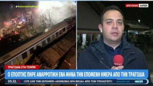 Στην αρχή παθαίνεις ένα σοκ, αλλά προσπαθείς να συνέλθεις αμέσως γιατί πρέπει να αναμεταδώσεις αυτή την κατάσταση στον θεατή, πρέπει να είμαστε όσο το δυνατόν ψύχραιμοι αντικρίζοντας μία τέτοια κατάσταση για την οποία δεν είχαμε ακόμη λεπτομέρειες. Στην αρχή είχαμε ένα γεγονός ότι συγκρούστηκαν δύο τρένα με πολλά θύματα, έπρεπε να μεταφέρουμε ό,τι βλέπαμε. Ένα χρόνο μετά περιμένουμε να αποδοθούν ευθύνες… Το μόνο που μπορούμε να πούμε στους συγγενείς των θυμάτων είναι να κάνουν όσο κουράγιο μπορούν. Είναι φτωχά τα λόγια για τους ανθρώπους που έχασαν τους δικούς τους, από την άλλη όμως πρέπει να αποδοθούν ευθύνες. Ήταν μία προδιαγεγραμμένη τραγωδία. Χτύπησε πολλές φορές “καμπανάκι” ότι θα γίνει κάτι τέτοιο, καθώς είχε προηγηθεί το δυστύχημα στο Άδενδρο».
