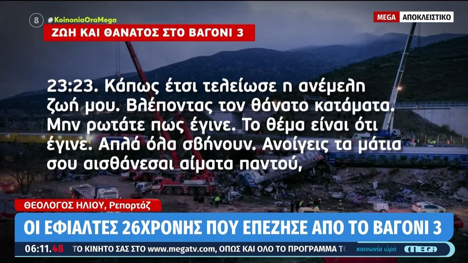 «Τρίτη βράδυ ήταν 28 Φεβρουαρίου. Στις 23.33 χτυπάει το τηλέφωνο. Την έχω ακόμα κρατημένη την κλήση. Ένας φίλος μου, με κάλεσε και μου είπε: ‘’Σε παρακαλώ μάθε τι έγινε στα Τέμπη κοντά στο μνημείο του ΠΑΟΚ. Με πήρε η κόρη μου και μου είπε έγινε έκρηξη σε τρένο, βλέπει αίματα και σπασμένα τζάμια’’. Προσπάθησα να τον καθησυχάσω, δεν πίστευα και εγώ αυτά που άκουγα. Οι πληροφορίες στην αρχή με το σταγονόμετρο. Τη μία έλεγαν σύγκρουση τρένου με φορτηγό, την άλλη εκτροχιασμός, λίγα λεπτά μετά επιβεβαιώθηκε. Δύο τρένα συγκρούστηκαν στο ύψος του Ευαγγελισμού. Είχα ήδη ετοιμάσει ρούχα, ξεκινήσαμε για Τέμπη. Στο δρόμο τηλέφωνα. Σταματάμε λίγο πριν το τούνελ εκεί όπου περίμεναν συγγενείς και λεωφορεία. Ασυναίσθητα, δεν έχω φτάσει ακόμα στο σημείο της τραγωδίας, προτίμησα να βρω πρώτα μαρτυρίες. Δύο γονείς δείχνουν να περιμένουν κάποιον. Στο βάθος φαίνεται μια ξανθιά κοπέλα. Φοράει μια κουβέρτα για εγκαυματίες. Βγάζω το μικρόφωνο και ετοιμάζομαι. Ασυναίσθητα πάλι όμως σα να με κράτησε ένα χέρι δεν πλησιάζω. Η νεαρή κοπέλα πέφτει στην αγκαλιά των γονιών της και κλαίει. «Μπαμπά, έχει νεκρούς τους είδα», είπε. Δεν θα την ξεχάσω ποτέ αυτή την εικόνα.