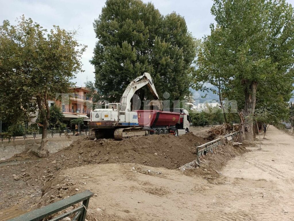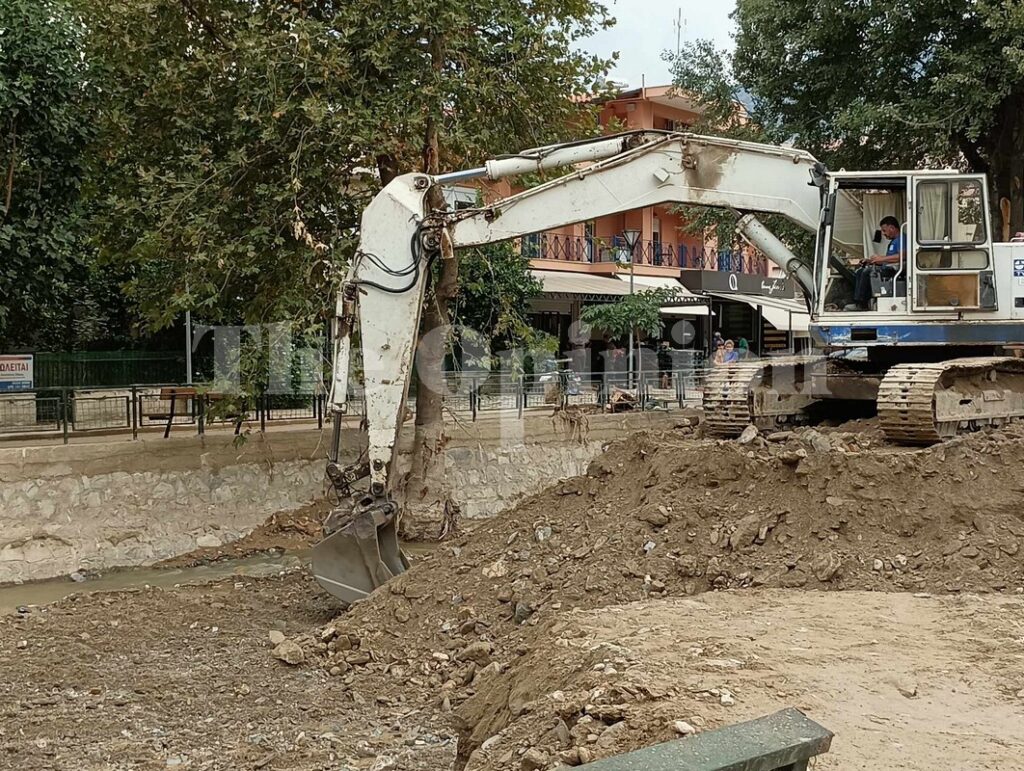 Την ίδια ώρα, τα μηχανήματα συνεχίζουν να απομακρύνουν τα φερτα υλικά από τον Κραυσίδωνα, καθώς σε ορισμένα σημεία έχουν ξεπεράσει το ύψος του δρόμου.