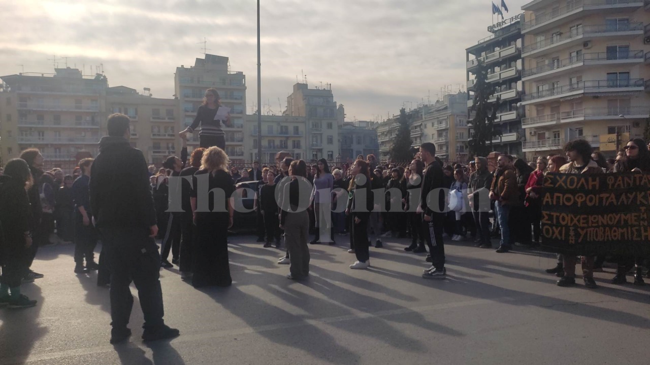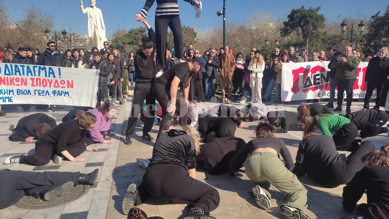 Οι φοιτητές παρουσίασαν το ίδιο δρώμενο και έξω από το υπουργείο Μακεδονίας Θράκης, όπου κατέληξε η πορεία λίγο μετά τις 14:00.