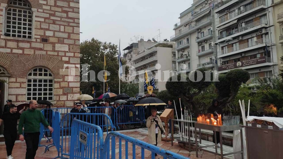 Παρά τον βροχερό καιρό και την έντονη βροχόπτωση πλήθος κόσμου συρρέει από το πρωί στον Ιερό Ναό του Αγίου Δημητρίου, προκειμένου να ασπαστεί την εικόνα του Αγίου αλλά και να παρακολουθήσει τη δοξολογία.