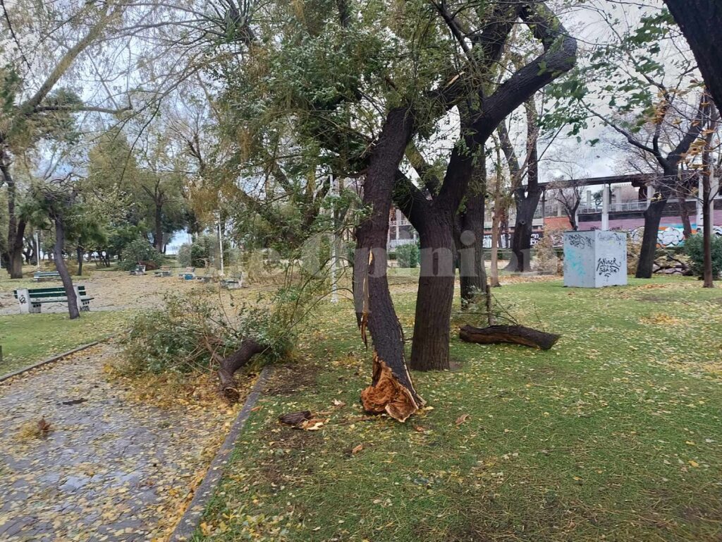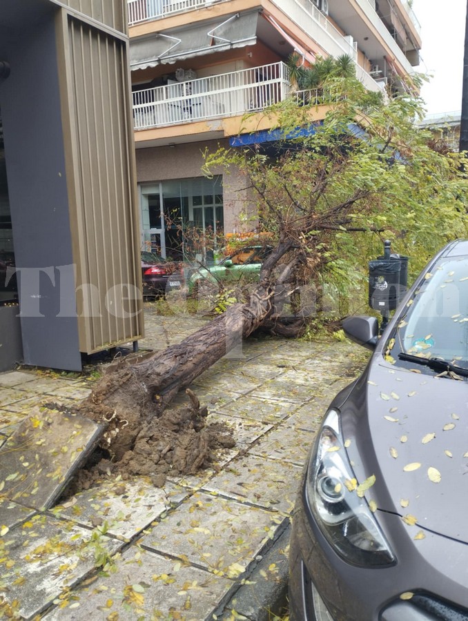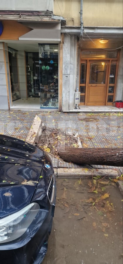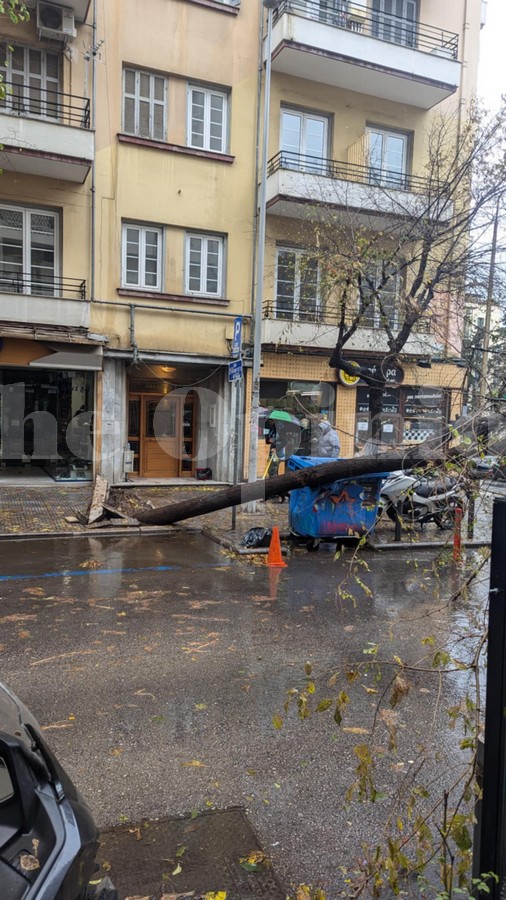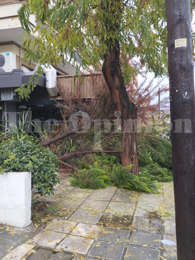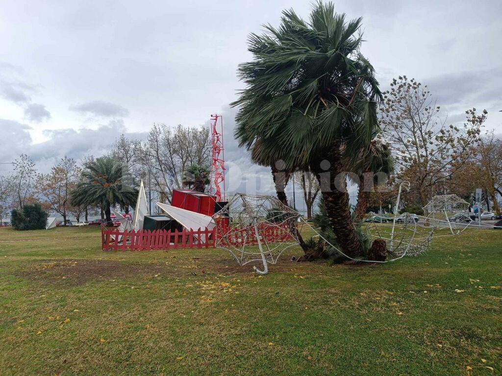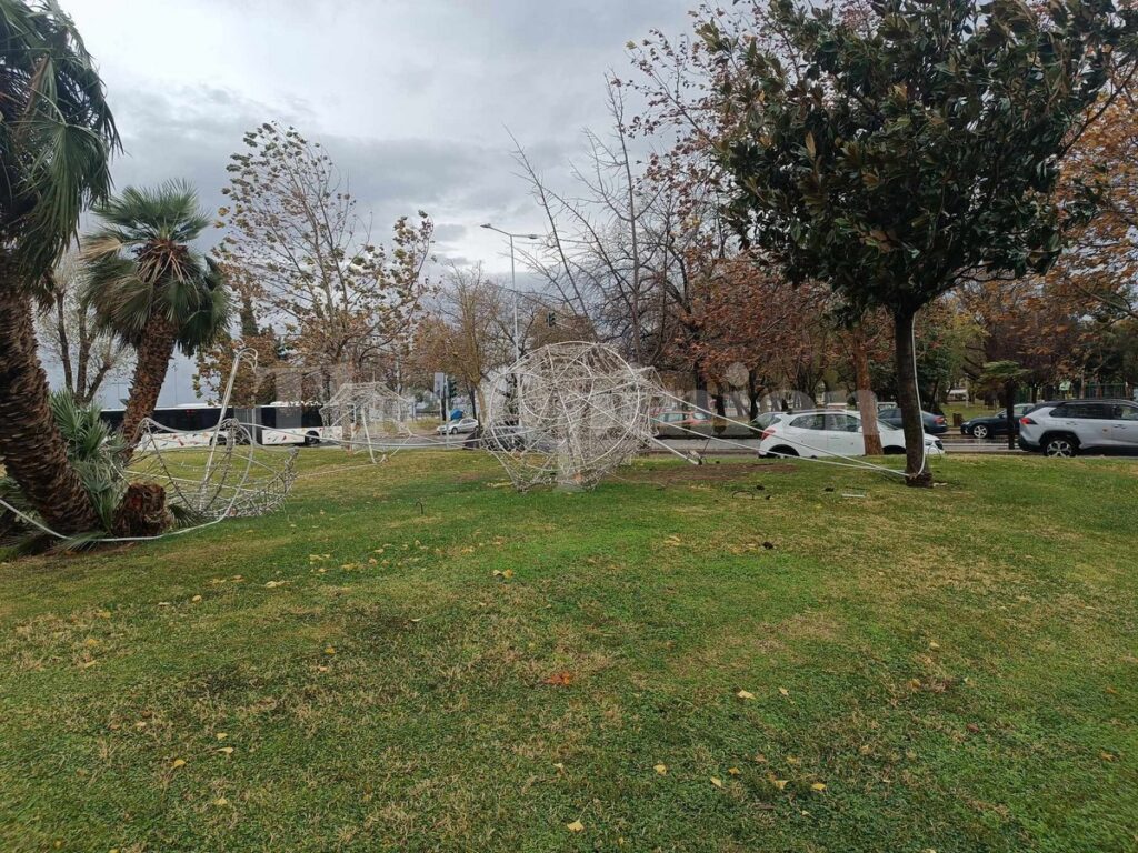 Ζημιές και στον εορταστικό διάκοσμο του δήμου Θεσσαλονίκης απέναντι από το δημαρχείο. Πτώσεις δέντρων και διακοπές ρεύματος και σε Βασιλικά και Σουρωτή.