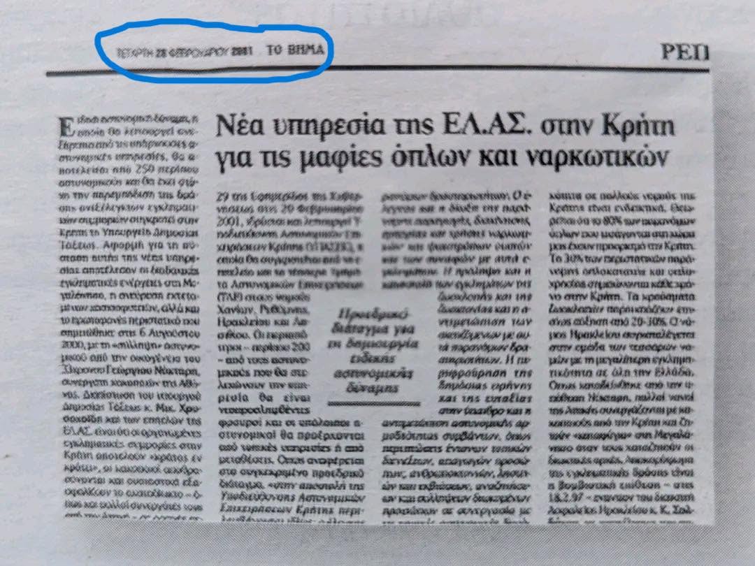 Διαβάζω λοιπόν στην εφημερίδα “Το Βήμα” της 28ης Φεβρουαρίου 2001 ότι μετά από ένα απίστευτο περιστατικό με την απαγωγή ενός αστυνομικού και σειρά εγκληματικών ενεργειών ο Μιχ. Χρυσοχοΐδης εξαγγέλλει την ίδρυση Υποδιεύθυνσης Αστυνομικών Επιχειρήσεων Κρήτης με 200 επιπλέον ειδικά εκπαιδευμένους αστυνομικούς, καθώς “δεν πάει άλλο, η Κρήτη δεν μπορεί να είναι κράτος εν κράτει”, όπως με περισσή αποφασιστικότητα δηλώνει στην εφημερίδα ο κ. Υπουργός.