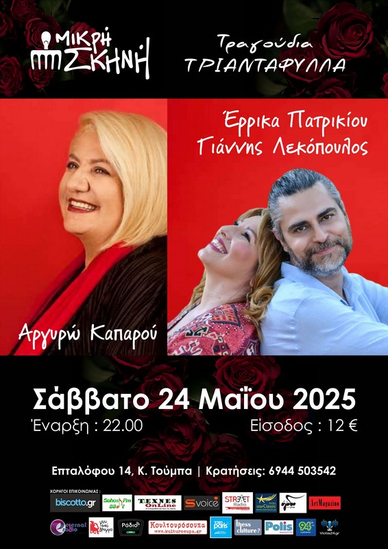Η Αργυρώ Καπαρού, η Έρρικα Πατρικίου και ο Γιάννης Λεκόπουλος ενώνουν τις φωνές τους στη Μικρή Σκηνή το Σάββατο, 24 Μαΐου, σε μία μουσική βραδιά γεμάτη «Τραγούδια Τριαντάφυλλα».