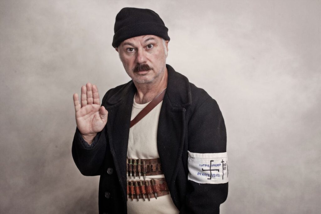 Αυτό, λοιπόν, σε ένα κομμάτι της παράστασης συνδέει τη Μικρασιατική καταστροφή, την εκστρατεία του ελληνικού στρατού στην Κριμαία το ’19 και στην Κορέα το ’53 με το Κυπριακό. Βγάζει πολύ γέλιο, βγάζει κι ένα «Ωωω» βαθύ.