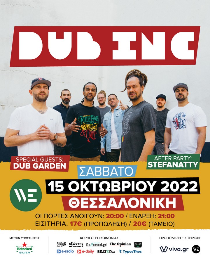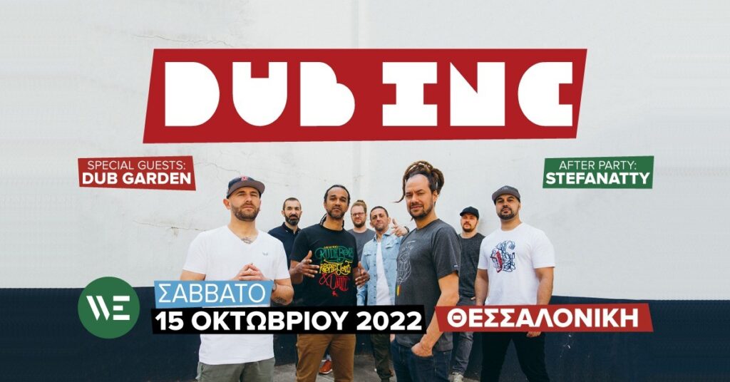 Οι Dub Inc, η κορυφαία ευρωπαϊκή μπάντα της world reggae μουσικής σκηνής επιστρέφει στη Θεσσαλονίκη το Σάββατο, 15 Οκτωβρίου, στον πολυχώρο WE. Μαζί τους, επί σκηνής, οι Dub Garden και ο Dj Stefanatty.