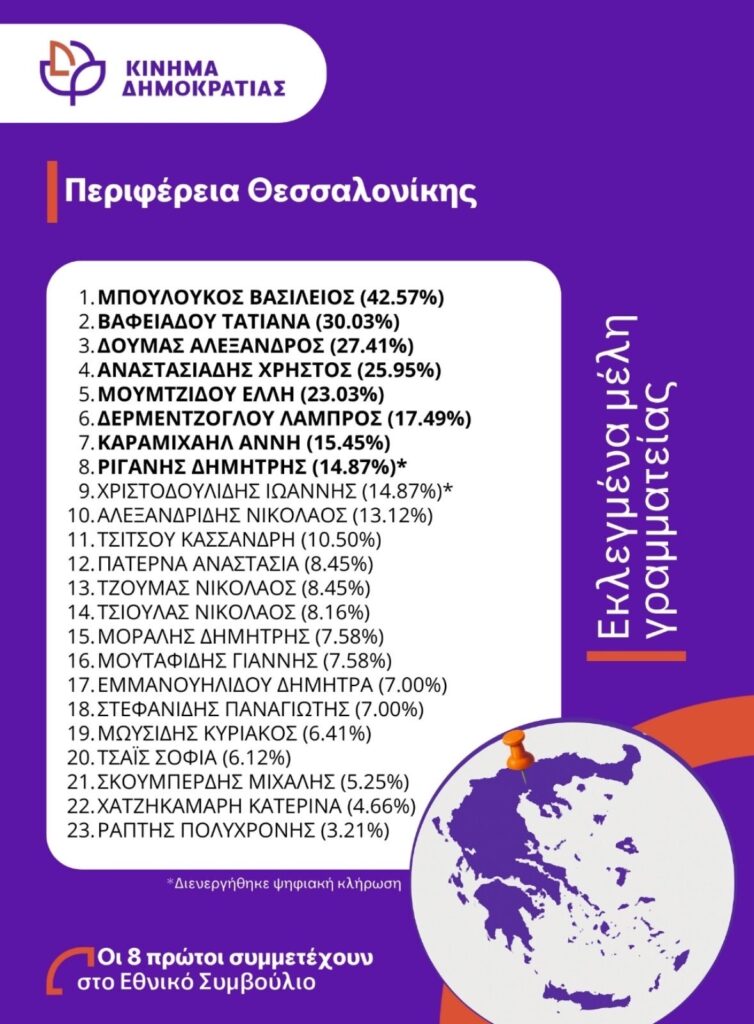 Πρώτος στον ΣΥΡΙΖΑ, πρώτος και στο Κίνημα Δημοκρατίας. Ο λόγος για τον Βασίλη Μπουλούκο που όντας γραμματέας ΣΥΡΙΖΑ Α’ Θεσσαλονίκης αποχώρησε και πρωτοστάτησε στην δημιουργία του Κινήματος Δημοκρατίας και επιβραβεύθηκε στις πρόσφατες εσωκομματικές εκλογές. Στην πρώτη συνεδρίαση της Γραμματείας της Περιφέρειας Θεσσαλονίκης του Κινήματος Δημοκρατίας εξέλεξε ομόφωνα στη θέση του Γραμματέα της Περιφέρειας Θεσσαλονίκης τον Βασίλη Μπουλούκο και στη θέση της αναπληρώτριας Γραμματέως την Τατιάνα Βαφειάδου. Επίσης, ομόφωνα ορίστηκαν οι υπεύθυνοι επικοινωνίας, αρχείου μελών, οικονομικών όπως και οι υπεύθυνοι των Τομέων και των Δημοτικών Οργανώσεων του Κινήματος Δημοκρατίας στη Θεσσαλονίκη.