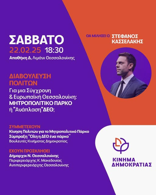 Στην πόλη, από διαβουλεύσεις όμως πάμε καλά. Για αυτό και επιστρέφει στην Θεσσαλονίκη ο ιδρυτής του Κινήματος Δημοκρατίας Στέφανος Κασσελάκης. Το Σάββατο στις 18:30 έχει καλέσει στην Αποθήκη Δ του ΟΛΘ την περιφερειάρχη, δημάρχους, συλλογικότητες και φορείς να μιλήσουν σε ανοικτή εκδήλωση-διαβούλευση για την ΔΕΘ. «Η Θεσσαλονίκη αξίζει να είναι μια πράσινη, σύγχρονη και ευρωπαϊκή πόλη! Η επιλογή́ είναι στα χεριά μας: Μητροπολιτικό́ Πάρκο ή “Ανάπλαση” ΔΕΘ; Θα μιλήσουμε, θα ακούσουμε για να συναποφασίσουμε για την πόλη που θέλουμε» αναφέρεται στο σχετικό κάλεσμα. Παρόντες θα είναι και οι βορειοελλαδίτες βουλευτές του Κινήματος, Κυριακή Μάλαμα, Θεοδώρα Τζάκρη και Μιχάλης Χουρδάκης.