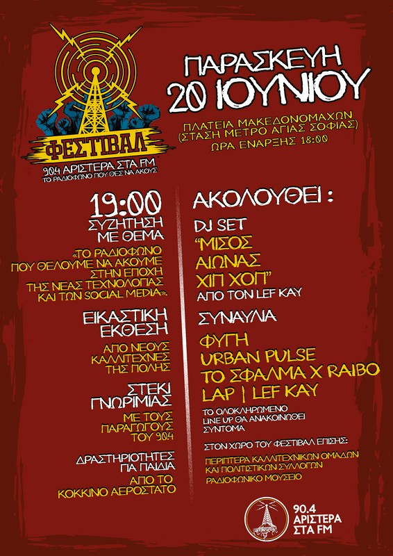Οχι ακριβώς μιντιακό αλλά και ολίγον πολιτικό. Την Παρασκευή 20 του Ιούνη το 1ο φεστιβάλ του “904 αριστερά στα fm”, ανοίγει τα μικρόφωνα του, στην καρδιά της Θεσσαλονίκης, στην Πλατεία Μακεδονομάχων (στάση μετρό Αγίας Σοφίας) από τις έξι το απόγευμα . Θα ξεκινήσει με μια συζήτηση για το παρόν και το μέλλον του ραδιοφώνου, της επίδρασης της νέας τεχνολογίας όπως η τεχνητή νοημοσύνη στο μέσο και η επιμονή ενός ριζοσπαστικού περιεχομένου στο πλαίσιο της αλλαγής των μορφών. Στην συζήτηση θα προσθέσουν στον προβληματισμό η Λουίζα Αυγήτα επίκουρη καθηγήτρια ιστορίας της τέχνης στο Τμήμα Εικαστικών και Εφαρμοσμένων Τεχνών, Σχολή Καλών Τεχνών, Α.Π.Θ. και ο Νίκος Βρέτος, Διδάκτωρ Πληροφορικής (PhD), ερευνητής στο ΕΚΕΤΑ Αμέσως μετα θα ακολουθήσει dj set “μισός αιώνας hiphop” από τον lef kay και στην συνέχεια συναυλία από τους: Φυγή, urban pulse, το σφαλμα x raido, LAP και Lef kay.