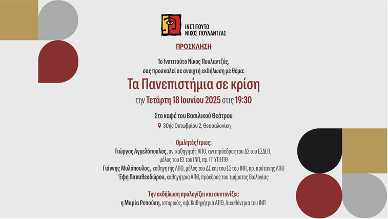 Στο πλαίσιο της επανεκκίνησής του, το Ινστιτούτο Νίκος Πουλαντζάς διοργανώνει την πρώτη του δημόσια εκδήλωση στη Θεσσαλονίκη. Επιθυμεί να λειτουργήσει ως τόπος συνάντησης των προοδευτικών πολιτών της πόλης και ως χώρος διαλόγου της πληθυντικής αριστεράς. Στην πρώτη εκδήλωση επιλέχθηκε να τεθεί ως θέμα το δημόσιο πανεπιστήμιο. Οι Γιώργος Αγγελόπουλος, Γιάννης Μυλοπόταμος και Έφη Παπαθεοδώρου αναμένεται να μιλήσουν για την ενίσχυση του μετώπου υπεράσπισης του δημόσιου πανεπιστημίου απέναντι στην υποχρηματοδότηση, τη θεσμική απαξίωση, την αστυνόμευση και τη μετατόπιση προς την ιδιωτικοποίηση της γνώσης.