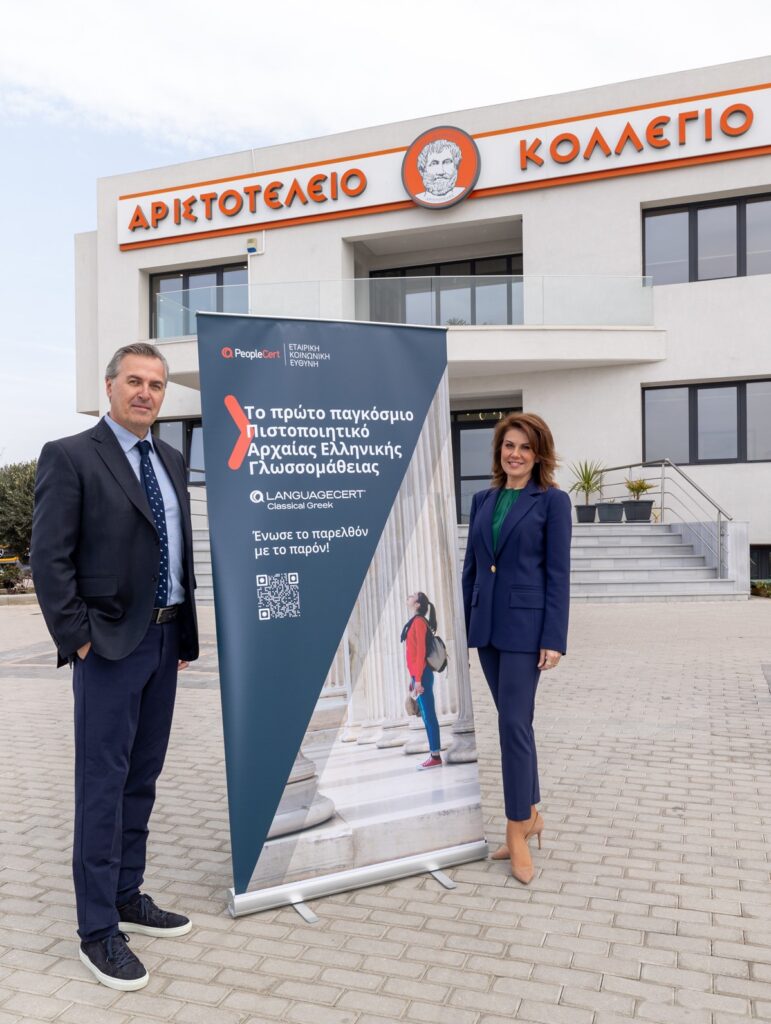 Η Ευγενία Μανωλίδου βρέθηκε στην πόλη μας με αντικείμενο την Αρχαία Ελληνική Γλώσσα. Το Αριστοτέλειο Κολλέγιο αποφάσισε να εντάξει στο πρόγραμμά του εξετάσεις πιστοποίησης στην «Αρχαία Ελληνική Γλώσσα». Στις εξετάσεις συμμετείχαν 290 μαθητές της β΄ και γ΄ Γυμνασίου, καθώς και της Α΄, Β΄ και Γ΄ Λυκείου. Η διαδικασία ολοκληρώθηκε με επιτυχία, όπως επιβεβαίωσαν οι υπεύθυνοι φιλόλογοι του προγράμματος M.Phil. Λεωνίδας Μούργκος και Δρ. Σωτήριος Μπαμπατζάνης, οι εκπαιδευτικοί, οι μαθητές και τα στελέχη της Peoplecert. Τον ενθουσιασμό της δεν έκρυψε και η Διευθύντρια της Ελληνικής Αγωγής, κ. Ευγενία Μανωλίδου, η οποία παραβρέθηκε στο Αριστοτέλειο Κολλέγιο, καθώς η εμπειρία και η συνδρομή της Ελληνικής Αγωγής και των εκπαιδευτικών της συνέβαλε τα μέγιστα στο πρωτοπόρο εγχείρημα.