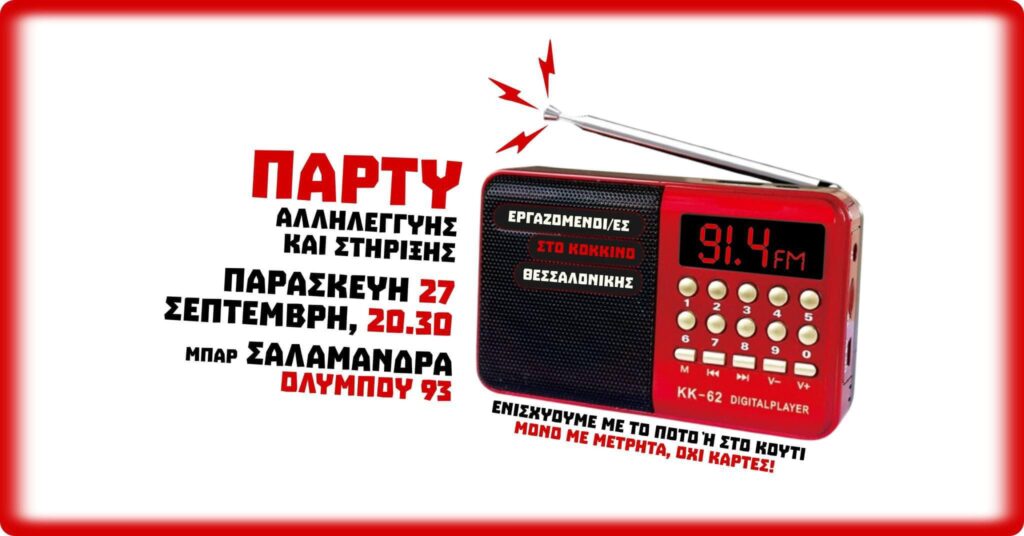 Να μείνουμε πάντως λίγο στα ΜΜΕ στην πόλη μας γιατί στηρίζουμε τους συναδέλφους μας και είμαστε στο πλευρό τους με όποιο τρόπο μπορούμε. Πάρτι αλληλεγγύης και στήριξης διοργανώνουν οι εργαζόμενοι και οι εργαζόμενες στο Κόκκινο Θεσσαλονίκης 91,4, την Παρασκευή 27 Σεπτεμβρίου στις 20:30 στο Μπαρ Σαλαμάνδρα (Ολύμπου 93).