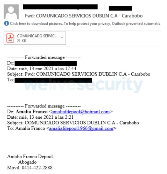 Για παράδειγμα, η ESET Research αποκάλυψε το 2021 μια κακόβουλη εκστρατεία που έβαλε στο στόχαστρο εταιρικά δίκτυα σε ισπανόφωνες χώρες χρησιμοποιώντας σύντομα μηνύματα ηλεκτρονικού ταχυδρομείου με συνημμένα αρχεία PDF.