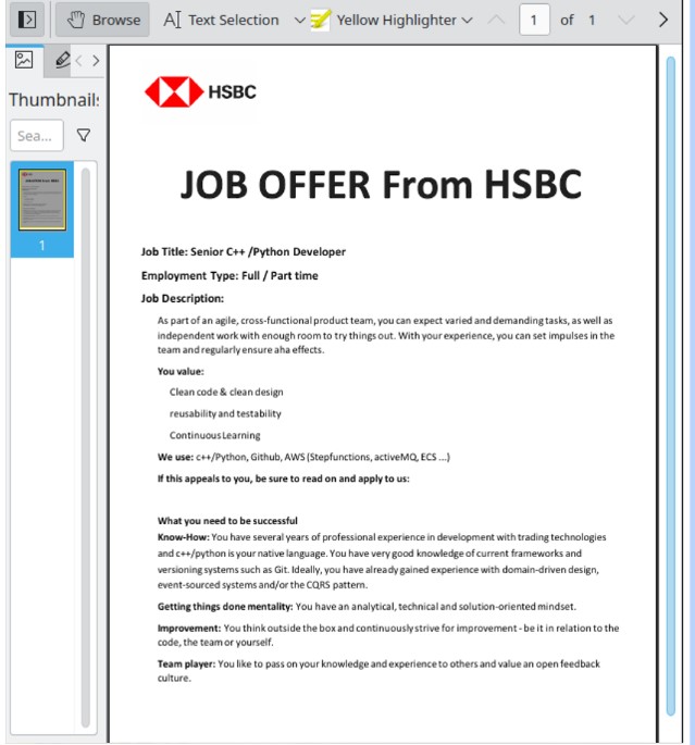 Τέτοιες απάτες υπάρχουν και σε δημοφιλείς πίνακες ανακοινώσεων για θέσεις εργασίας, γι’ αυτό προσπαθείτε πάντα να επαληθεύετε αν ο προϊστάμενος που επικοινώνησε μαζί σας ή η προσφορά εργασίας που βλέπετε είναι νόμιμη. Η εκστρατεία είχε στόχο χρήστες Linux με ένα αρχείο ZIP που παραδίδει μια ψεύτικη προσφορά εργασίας της HSBC ως δόλωμα