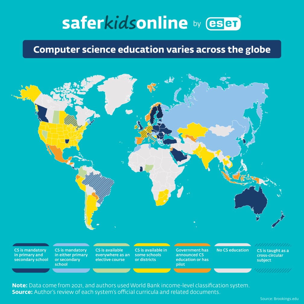 Οι προβλέψεις δείχνουν ότι στο μέλλον, 9 στις 10 θέσεις εργασίας θα απαιτούν προηγμένες ψηφιακές δεξιότητες. Παρά το γεγονός ότι τα παιδιά είναι «κολλημένα» στις έξυπνες συσκευές τους σχεδόν όλη την ώρα, πολλά εξακολουθούν να μην κατανοούν σε βάθος πώς να τις χρησιμοποιούν αποτελεσματικά. Ακόμα και οι νέοι ενήλικες, που μπαίνουν τώρα στην αγορά εργασίας, δυσκολεύονται. Πώς είναι δυνατόν να συμβαίνει αυτό; Σε πολλές χώρες, η ψηφιακή εκπαίδευση δε θεωρείται ακόμη αρκετά σημαντική ώστε να συμπεριληφθεί στο πρόγραμμα σπουδών των σχολείων. Ο παρακάτω χάρτης δείχνει πώς αντιμετωπίζεται η ψηφιακή εκπαίδευση σε όλο τον κόσμο. Όπως μπορείτε να δείτε, σε πολλές χώρες, η εκπαίδευση στην πληροφορική υπάρχει μόνο σε ορισμένες βαθμίδες της εκπαίδευσης ή και καθόλου.