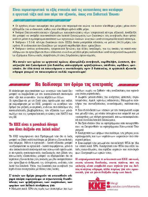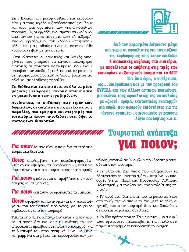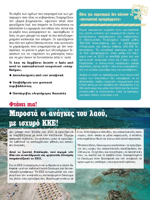 «Στην Ελλάδα των ρεκόρ αφίξεων και κερδοφορίας για τους µεγάλους ξενοδοχειακούς οµίλους και τους touroperators, οι εργαζόµενοι πρέπει να «κόβουν» από παντού για να πάνε µια κοντινή εκδροµή» γράφει στο καλοκαιρινό του φυλλάδιο το ΚΚΕ.