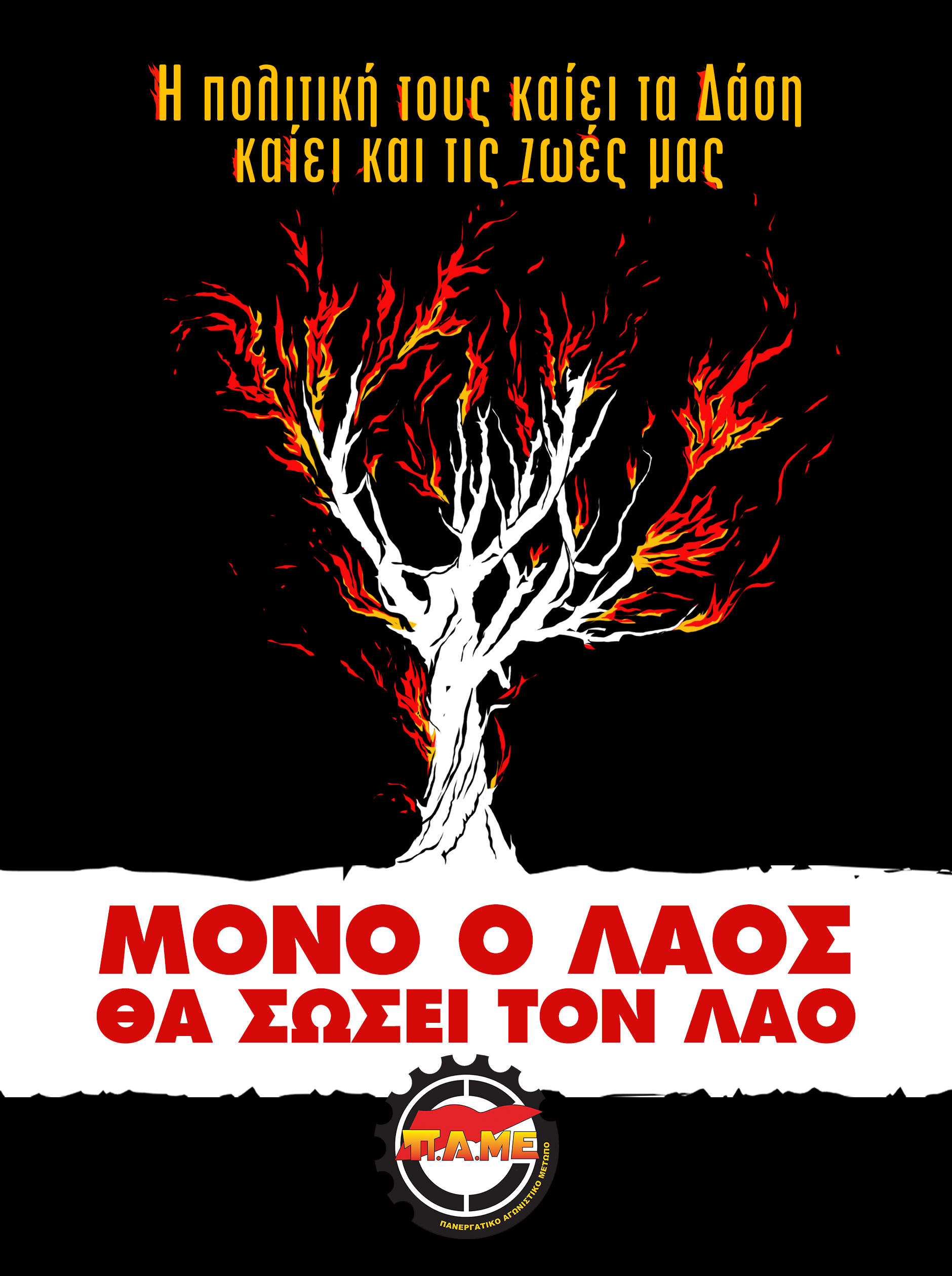 Στοχευμένη η νέα αφίσα του ΠΑΜΕ για τις καταστροφικές πυρκαγιές των τελευταίων ημερών στην Ελλάδα.