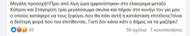 Στο μεταξύ, προχθές σημειώθηκε και νέο περιστατικό όπως καταγγέλλει μητέρα στα μέσα κοινωνικής δικτύωσης. Σύμφωνα με την ίδια, τα σκυλιά προσπάθησαν να επιτεθούν στο παιδί της. «Μεγάλη προσοχή! Εμφανίστηκαν στο Ελαιόρεμα μεταξύ Κύπρου και Σταγειρίτη τρία μεγαλόσωμα σκυλιά και πήραν στο κυνήγι τον γιο μου ο οποίος κατάφερε να τους ξεφύγει..που θα πάει αυτή η κατάσταση επιτέλους; είναι η δεύτερη φορά που του επιτίθενται», γράφει στην ανάρτηση της η μητέρα του αγοριού.
