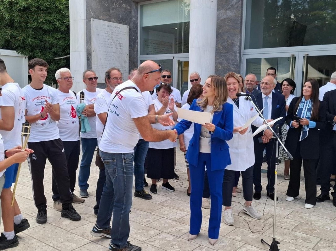 Στη συνέχεια, η Γενική Γραμματέας υποδέχθηκε στην Κεντρική είσοδο του Π.Γ.Ν.Θ. «ΑΧΕΠΑ», τους λαμπαδηδρόμους της 22ης Πανελλήνιας Λαμπαδηδρομίας που διοργανώνει η Πανελλήνια Ομοσπονδία Συλλόγων Εθελοντών Αιμοδοτών Ελλάδος, με σκοπό τη διάδοση της ιδέας της Εθελοντικής Αιμοδοσίας.