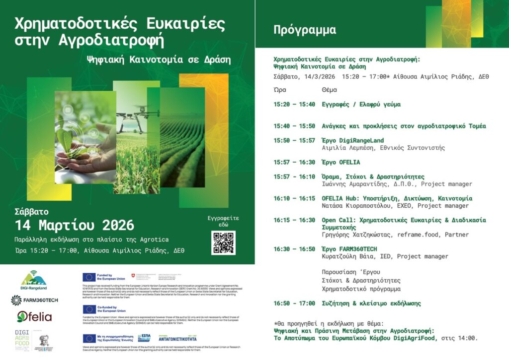 Ανοιχτή εκδήλωση ενημέρωσης και δικτύωσης με τίτλο «Χρηματοδοτικές Ευκαιρίες στην Αγροδιατροφή: Ψηφιακή Καινοτομία σε Δράση», διοργανώνει η συνεργασία των έργων DigiAgriFood, Digi-Rangeland, OFELIA, και FARM360TECH.